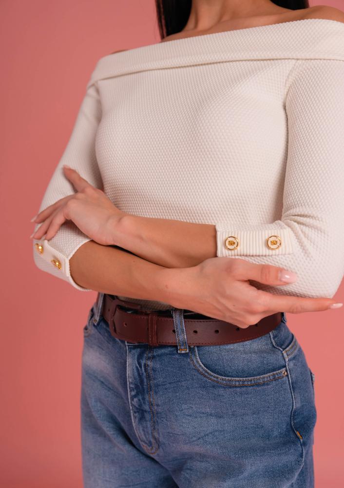 Vaj színű, pamut Magenta felső, szűkebb fazonú, vállat szabadon hagyó, 3/4 ujjal, ujján díszgombokkal.
