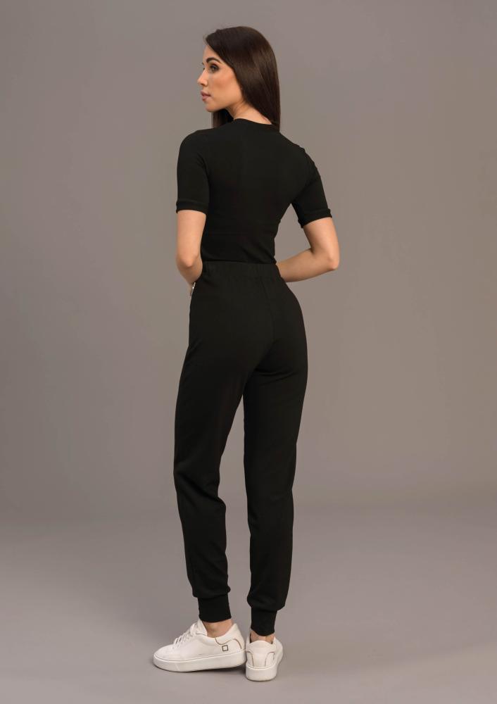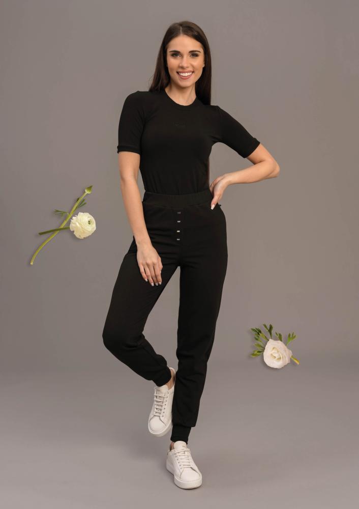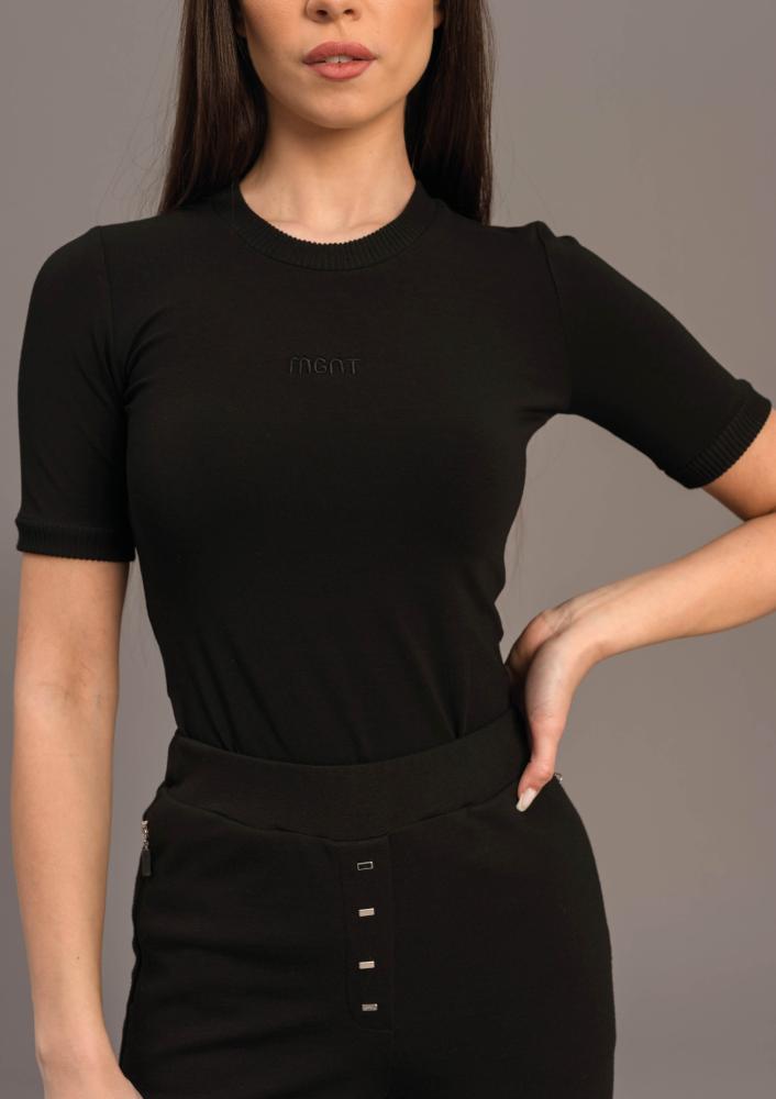 Fekete színű, Magenta felső, szűkebb fazonú, kerek nyakkivágással, ujján és nyakán passzéval. Elején filmnyomott Magenta márkajelzés.