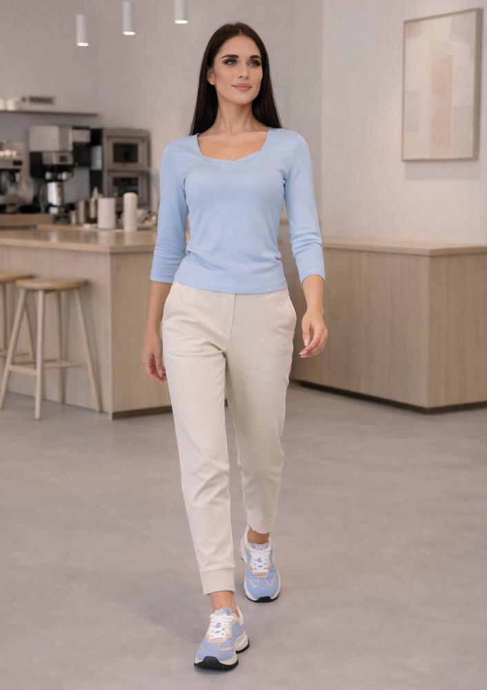 Kék színű, elasztikus viszkóz Magenta felső, szűkebb fazonú, elején V-nyakkivágással, hosszú ujjal. Hátul filmnyomott Magenta márkajelzés.