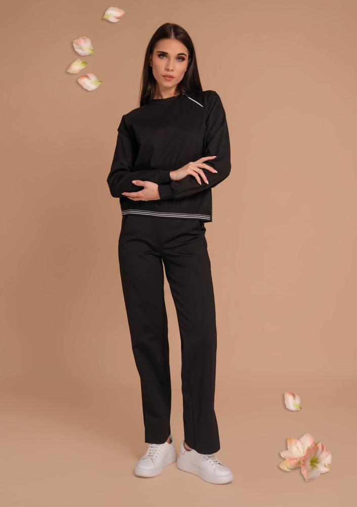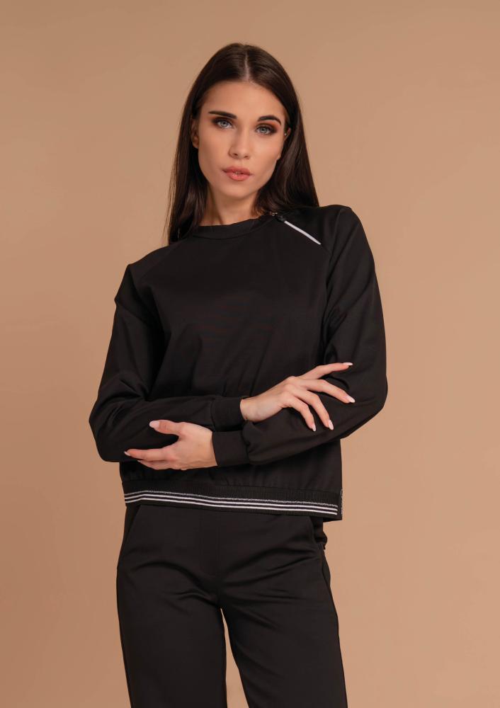 Fekete színű, elasztikus Magenta felső, sportos, laza fazonú, nyakrészen zippzárral díszített, gumis aljjal. Oldalán hímzett Magenta márkajelzés.