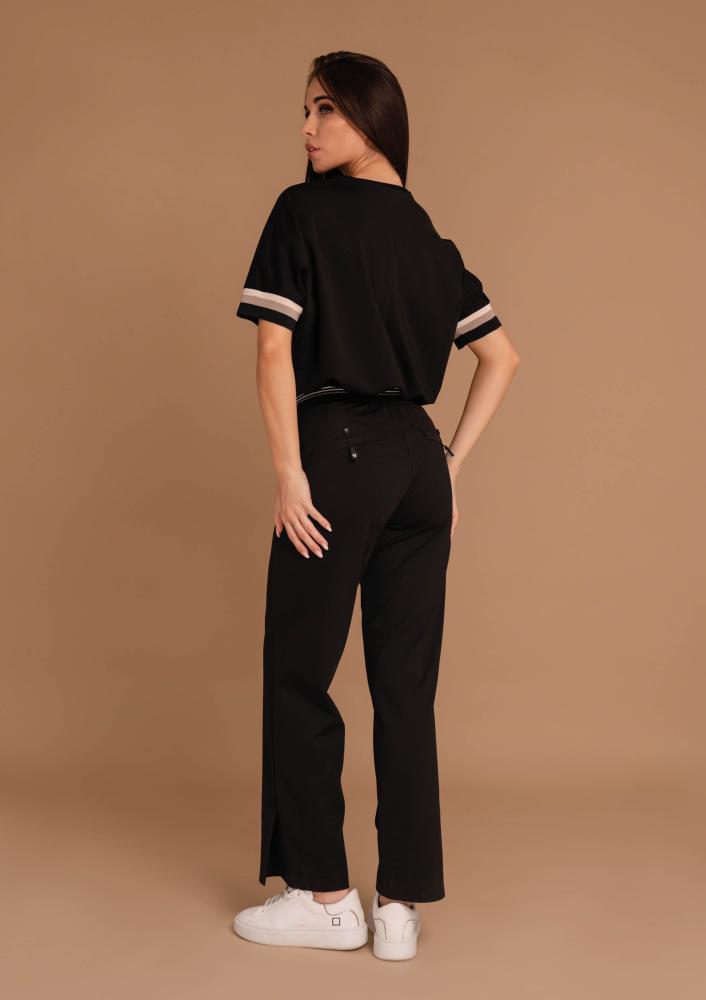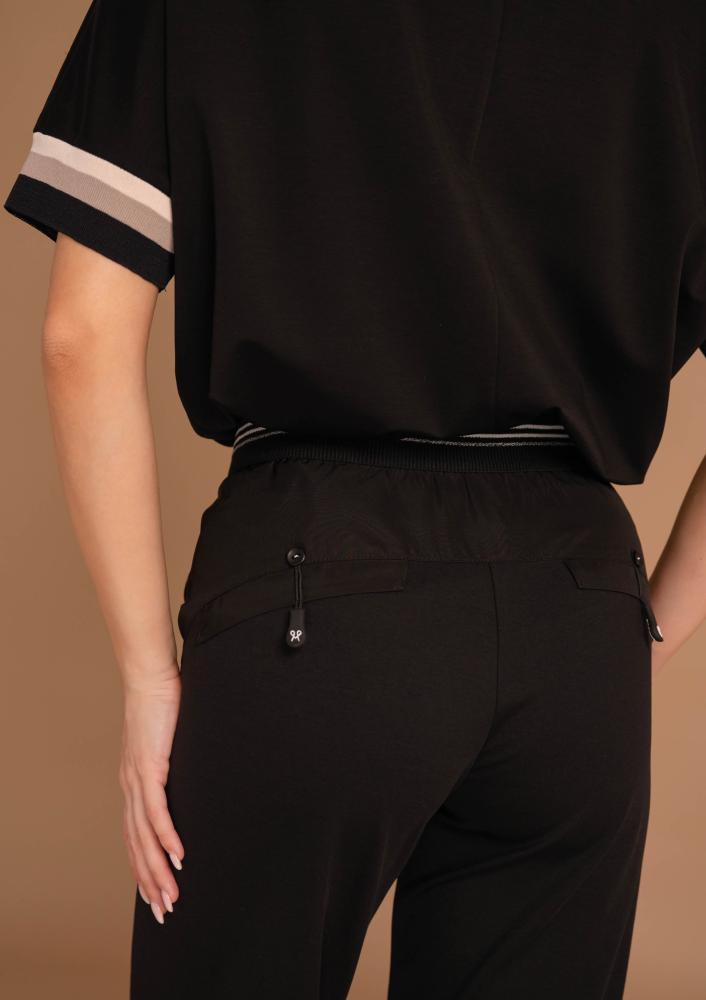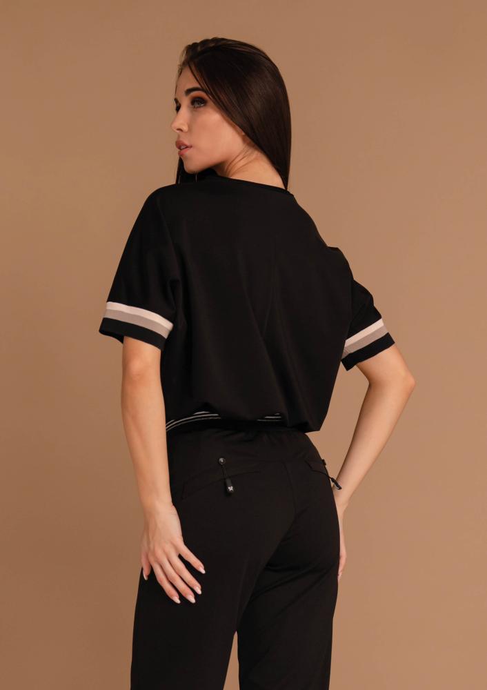 Fekete színű, viszkóz Magenta felső, laza fazonú, kerek nyakkivágással, ujján passzéval. Elején filmnyomott magenta márkajelzés.