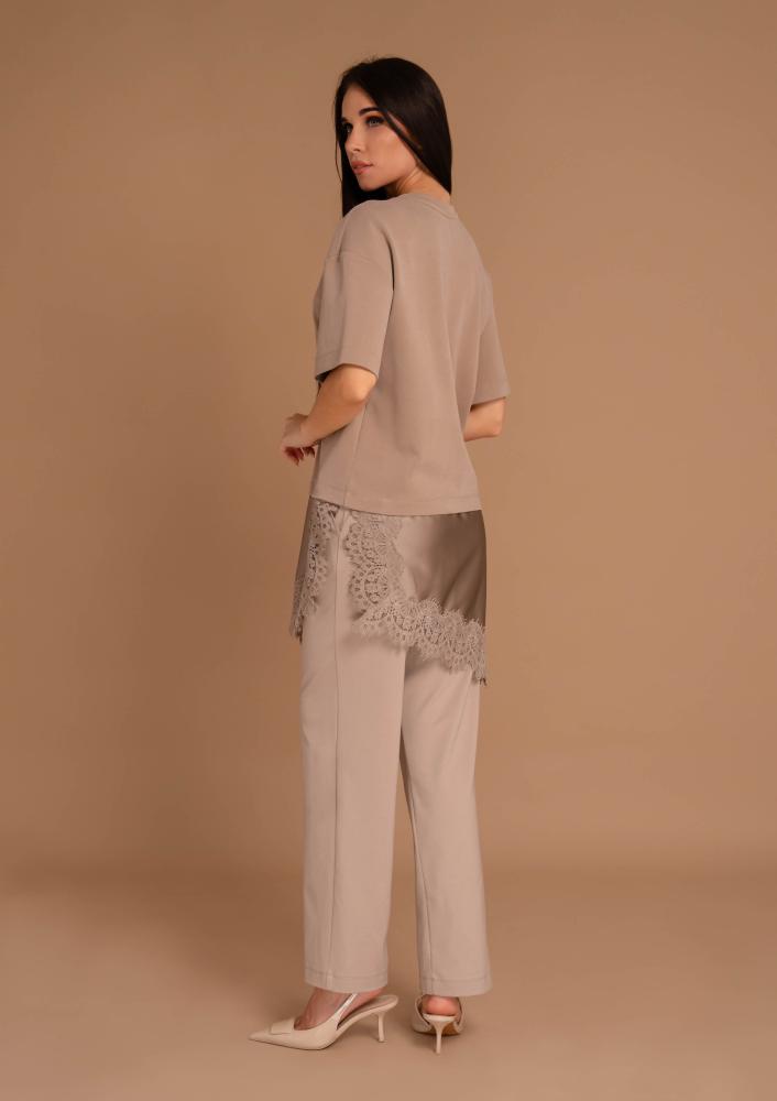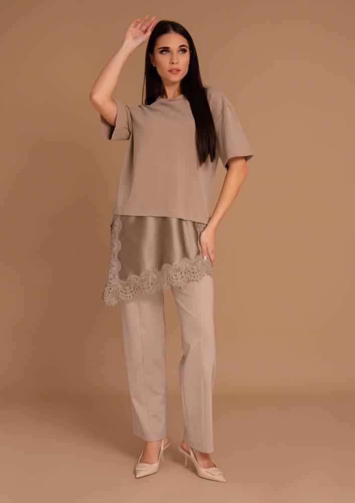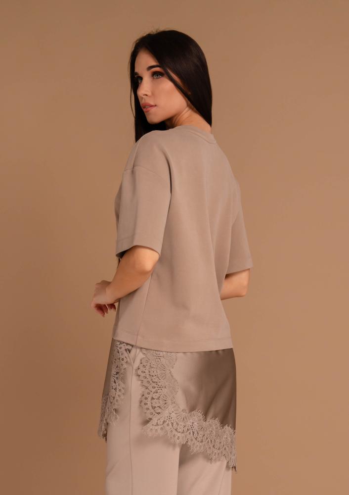 Bézs színű, Magenta felső, laza fazonú, kerek nyakkivágással, rövid ujjal, alján asszimetrikus-csipkés részlettel. Oldalán rávarrt textil Magenta márkajelzés.