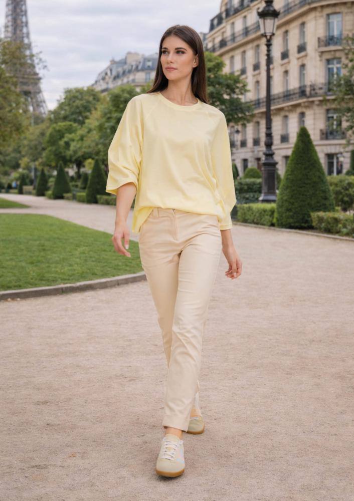 Sárga színű, kevert szálas Magenta felső, bő fazonú, ujján hajtásokkal díszített, kerek nyakkivágással. Hátul filmnyomott Magenta márkajelzés.