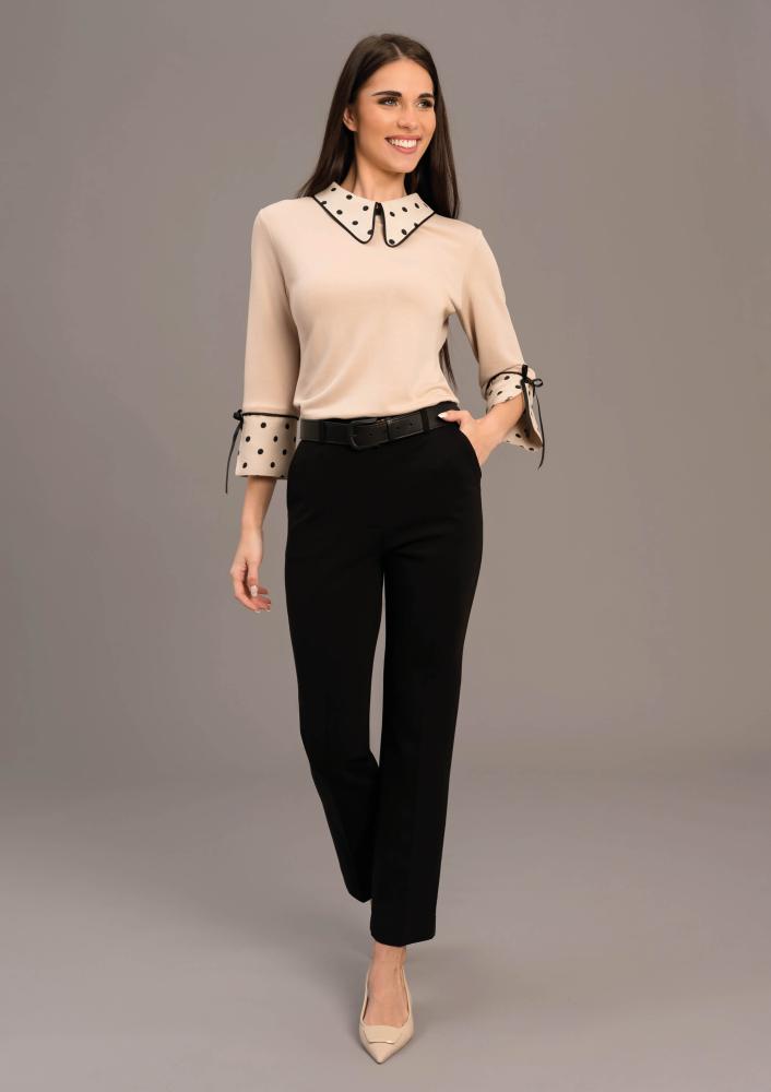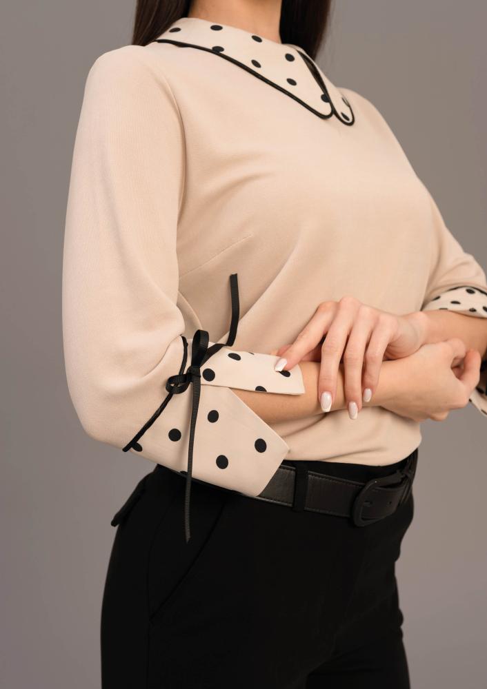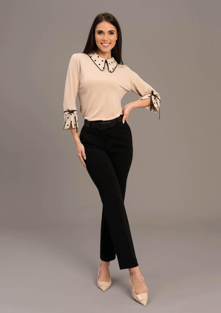 Bézs színű, elasztikus viszkóz Magenta felső, szűkebb fazonú, pöttyös mintás gallérral és széles mandzsettával, masni díszítéssel. Oldalán filmnyomott Magenta márkajelzés.