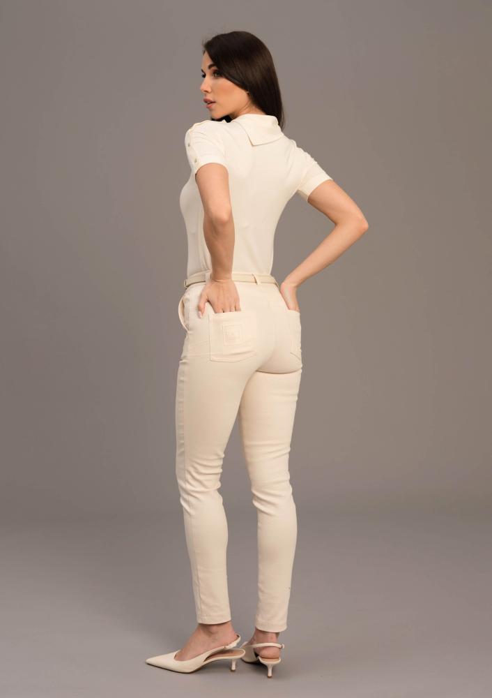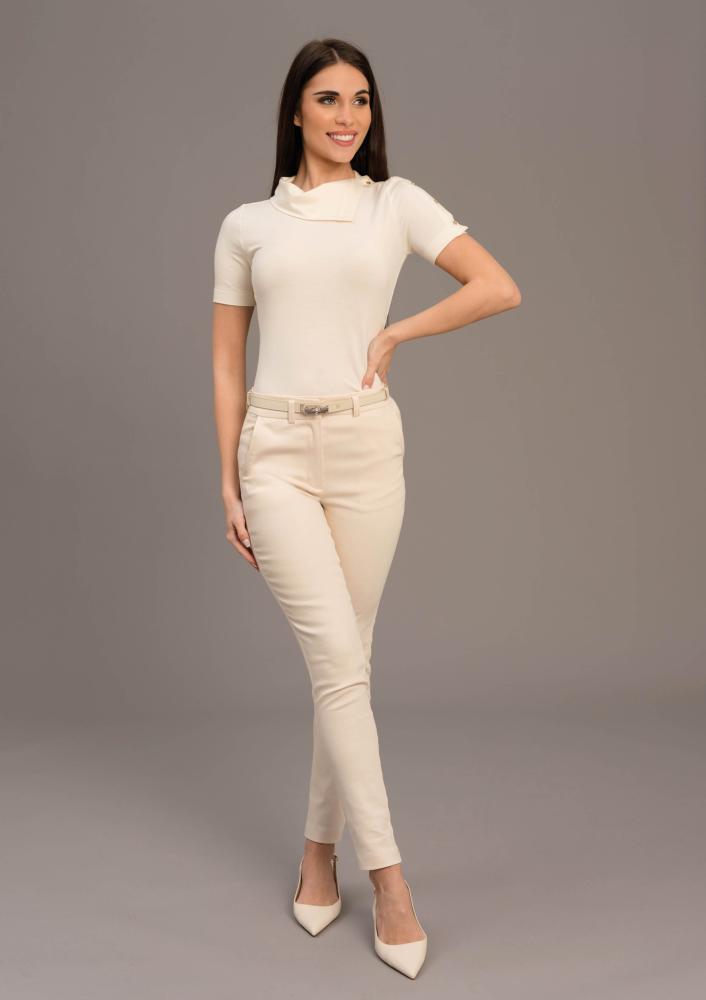 Vaj színű, elasztikus Magenta felső, szűk fazonú, rövid ujjú, nyakrészen kihajtott gallér részlettel, ujján dísz arany gombokkal. Oldalán rávarrt textil Magenta márkajelzés.