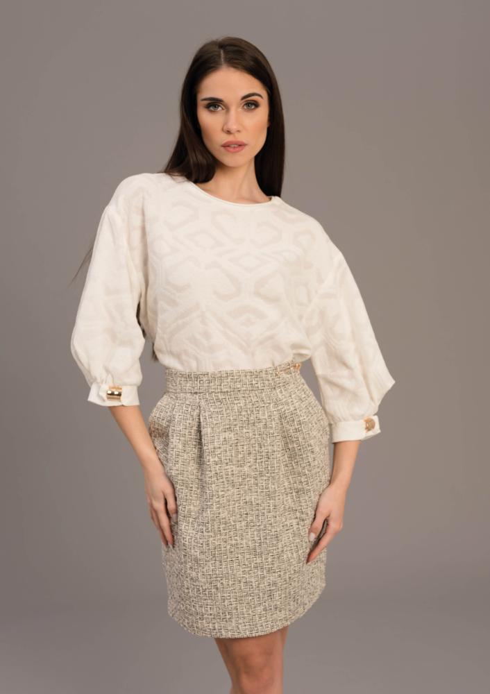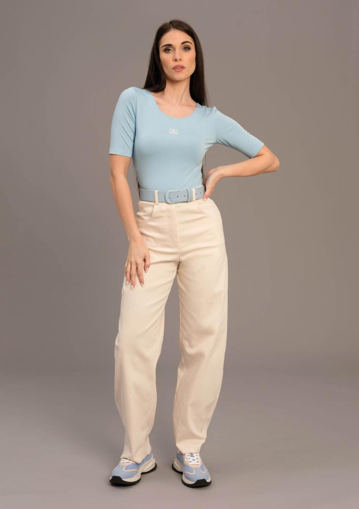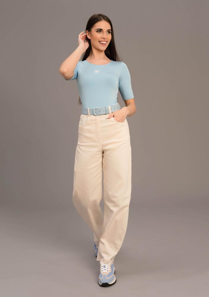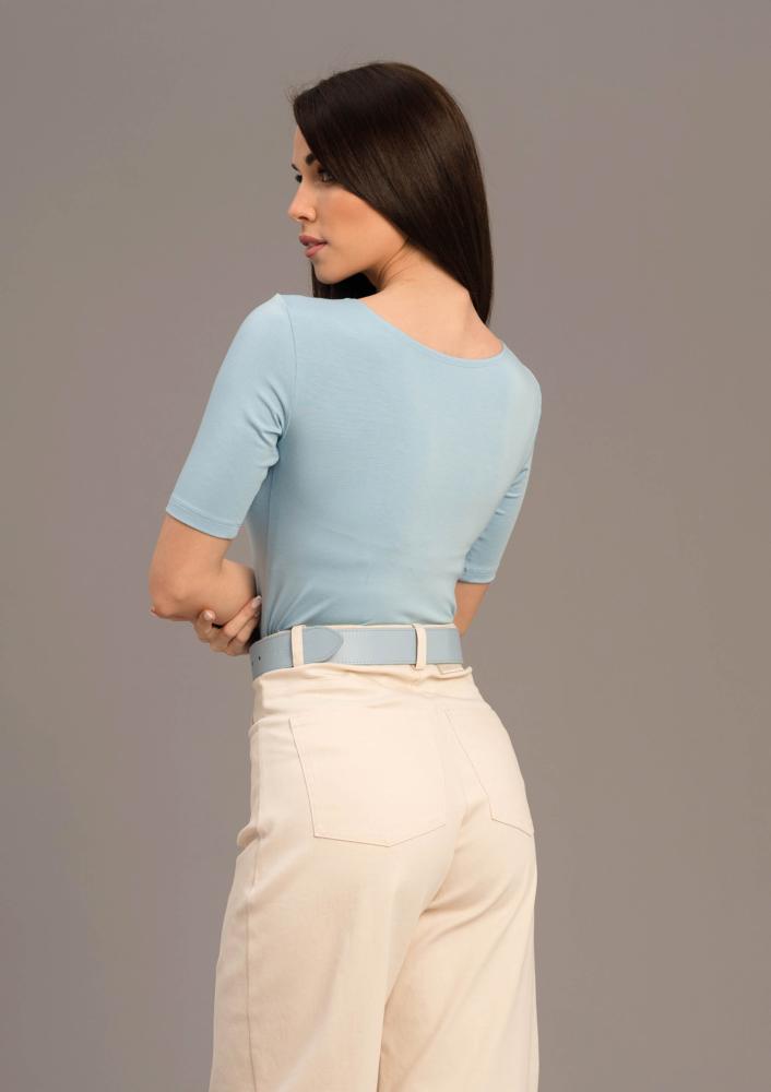 Kék színű, elasztikus viszkóz Magenta felső, szűk fazonú, 3/4 ujjhosszal. Elején filmnyomott Magenta márkajelzés.