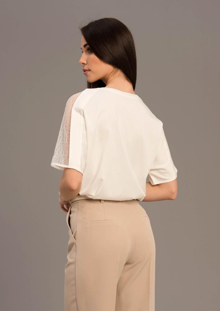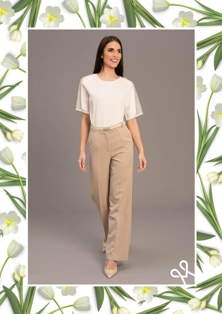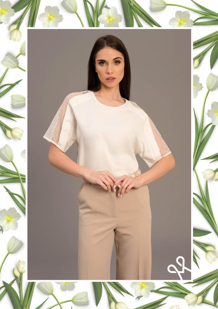 Vaj színű, elasztikus viszkóz Magenta felső, laza fazonú, kerek nyakkivágással, vállán áttetsző beépítéssel. Oldalán rávarrt textil Magenta márkajelzés.
