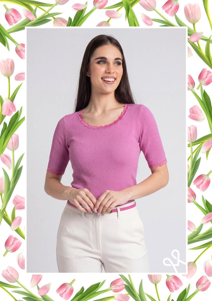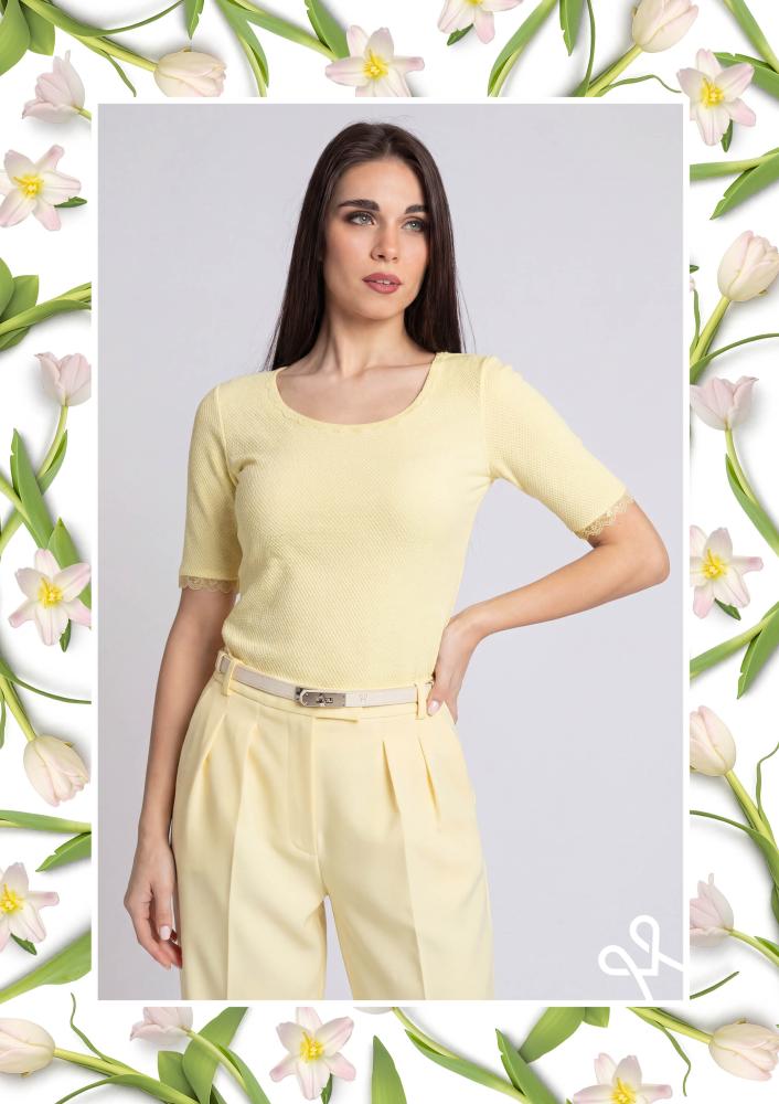 Sárga színű, 3-D mintás Magenta felső, szűk fazonú, mély nyakkivágással, 3/4 ujjhosszal, nyakán és ujján csipke díszítéssel. Oldalán rávarrt textil Magenta márkajelzés.
