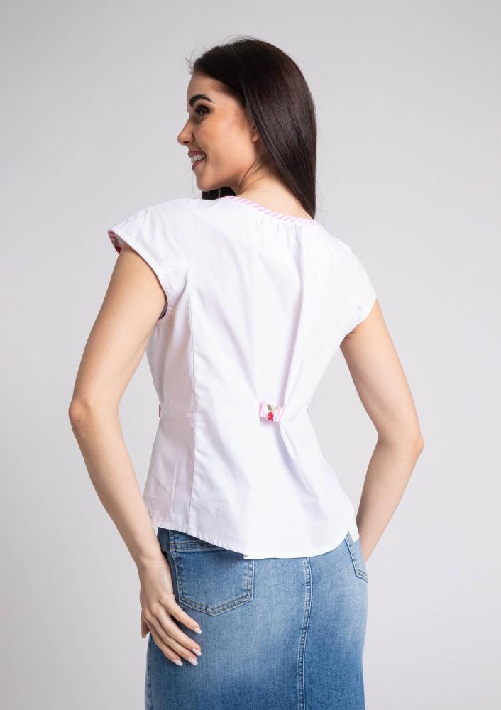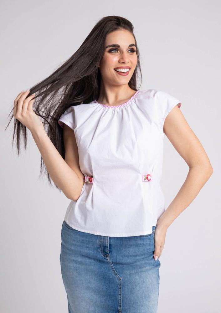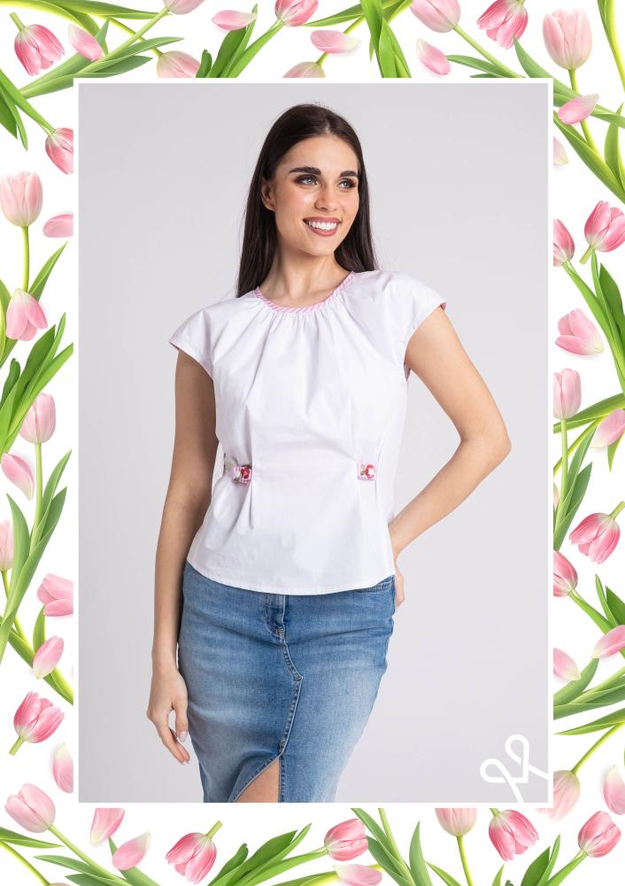 Vaj színű, vászon Magenta felső, bő fazonú, ráncolt nyakkivágással, csapott rövid ujjal, elején hajtásokkal. Oldalán rávarrt textil Magenta márkajelzés.