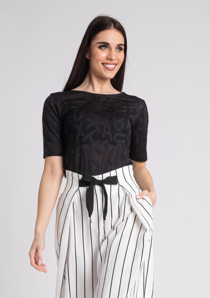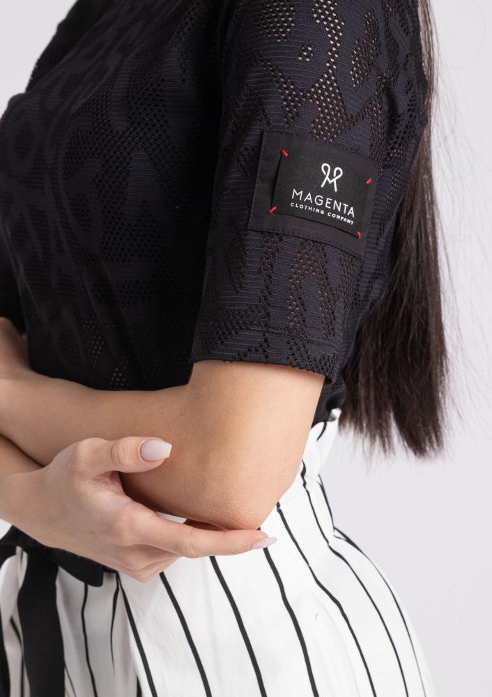 Fekete színű, Magenta felső, szűk fazonú, anyagában mimtás, enyhén áttetsző, hátul mélyebb kerekített nyakkivágással, rövid ujjakkal. Ujján rávarrt textil Magenta márkajelzés.