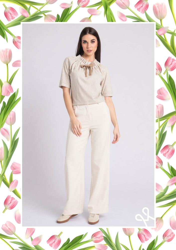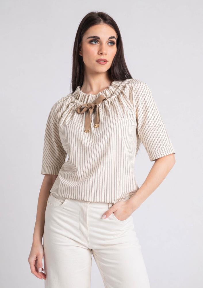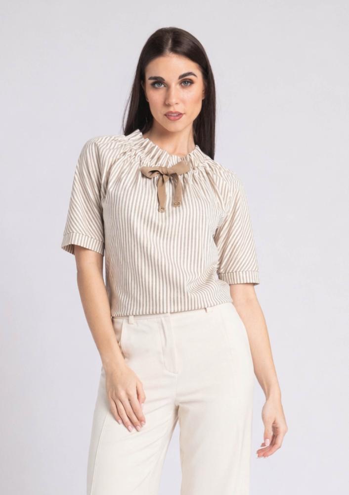 Csíkos, kevert szálas Magenta blúz, laza fazonú, nyakkörön húzott megoldással és masni díszítéssel. Oldalán rávarrt textil Magenta márkajelzés.