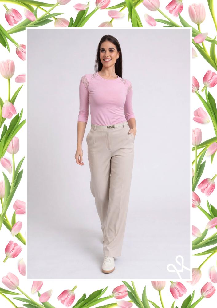 Rózsaszín színű, elasztikus viszkóz Magenta felső, szűk fazonú, vállán és hátán tüll beépítéssel, kerek nyakkivágással. Oldalán rávarrt textil Magenta márkajelzés.