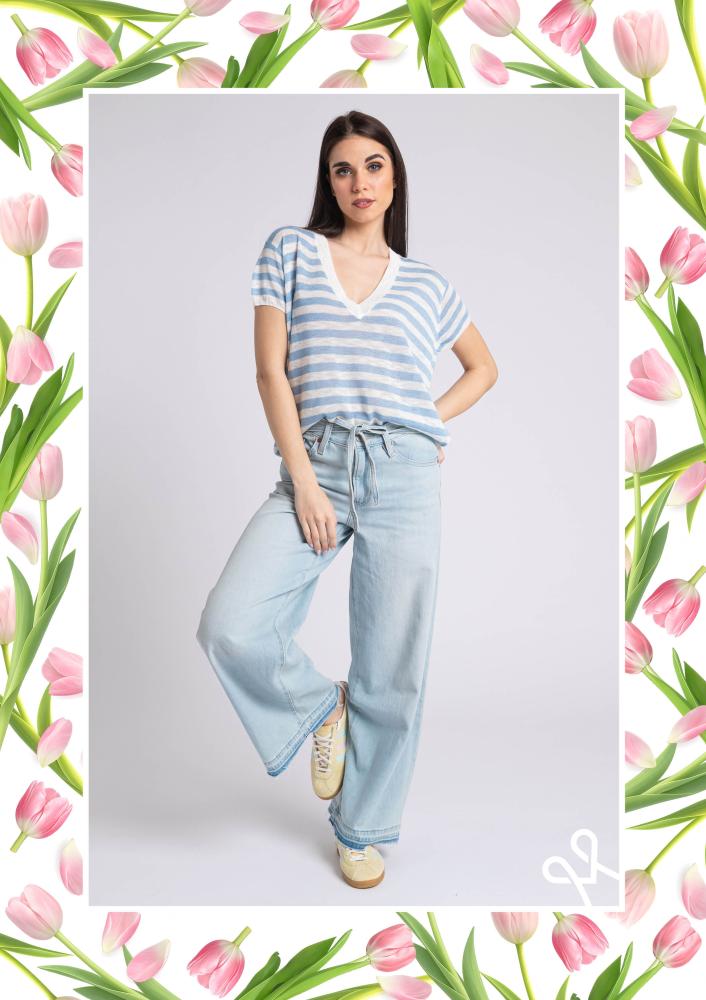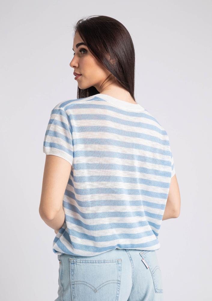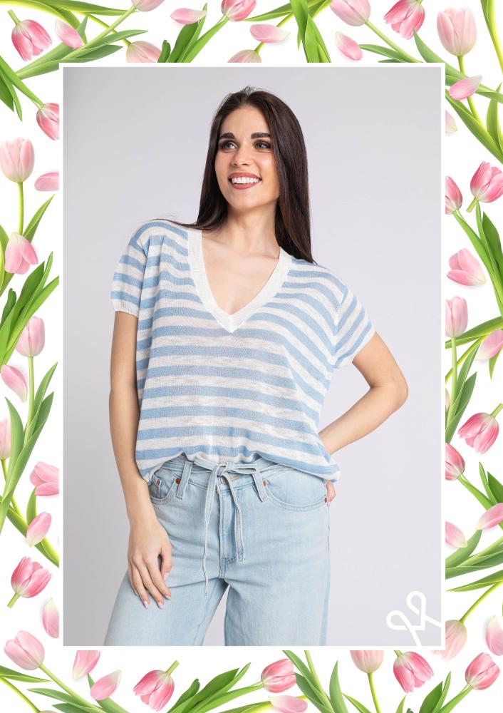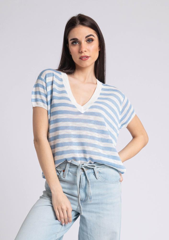 Csíkos, vékony kötésű, Magenta kötött felső, V-nyakkivágással, rövid ujjal. Oldalán rávarrt textil Magenta márkajelzés.