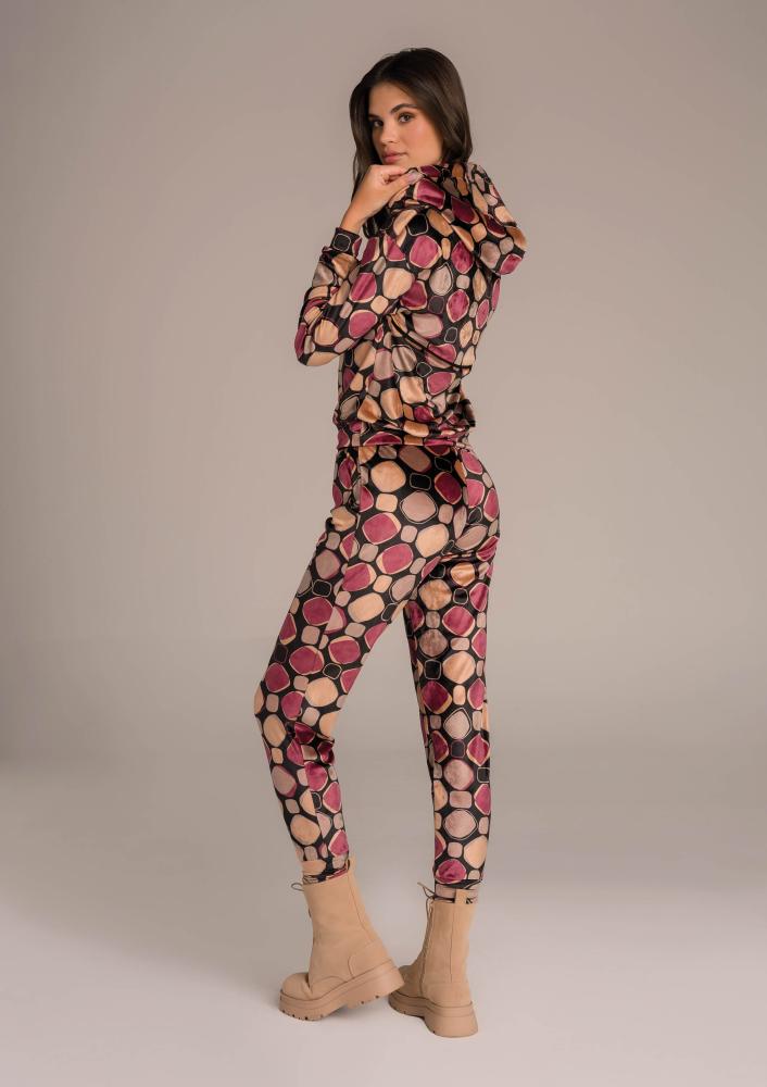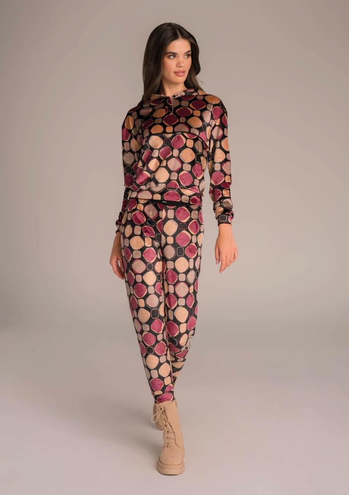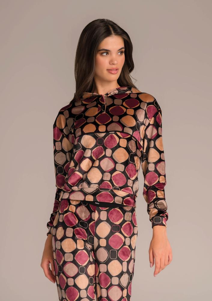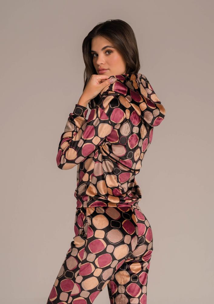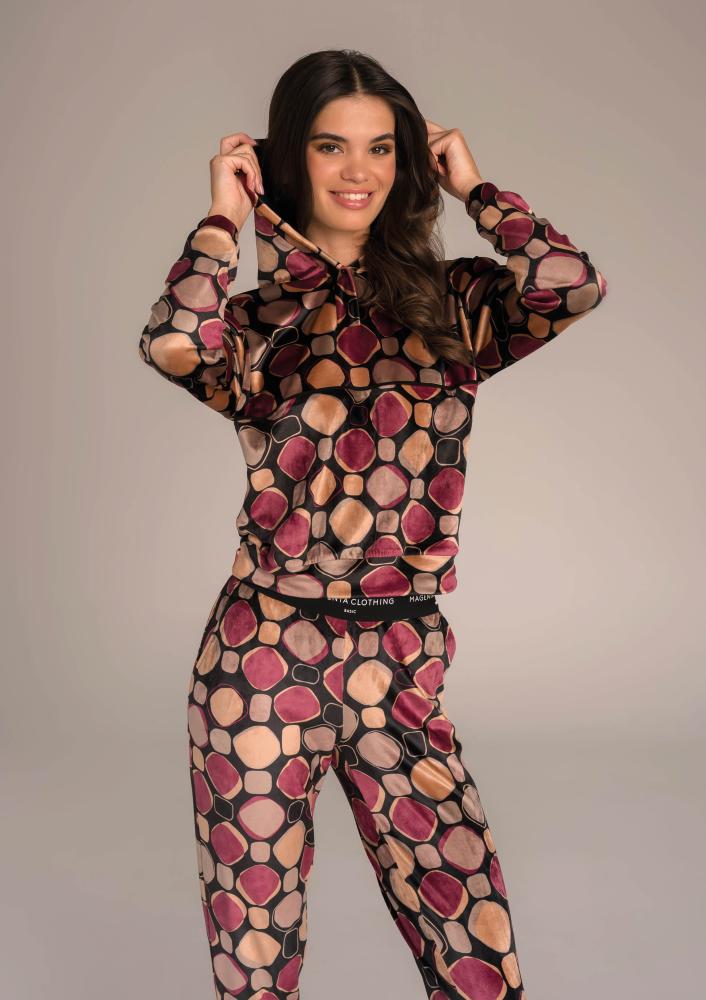 Mintás, plüss Magenta melegítő felső, laza fazonú, kapucnival, nyakrészen patentos záródással, zsebekkel. Oldalán rávarrt textil Magenta márkajelzés.