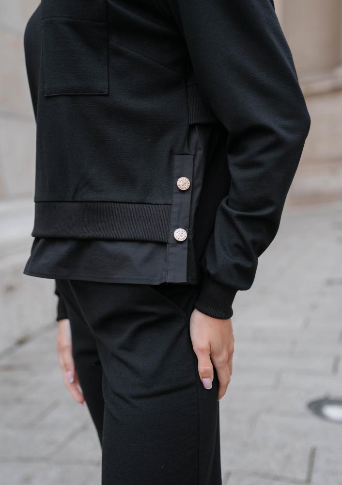 Fekete színű, Magenta pulóver, bő fazonú, elején foltzsebbel díszítve, kerek nyakkivágással, ujja végén passzéval. Oldalán rávarrt textil Magenta márkajelzés.