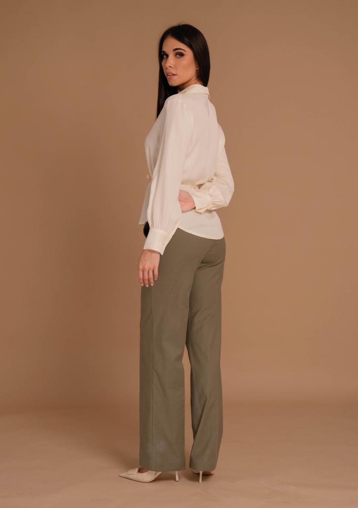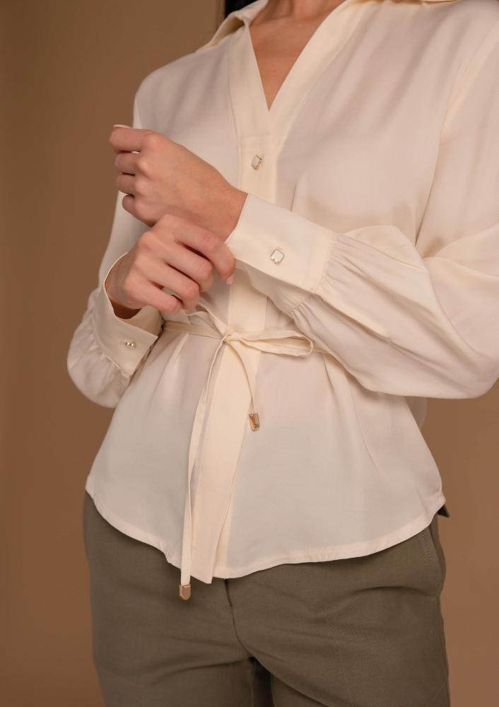 Vaj színű, kevert szálas Magenta ing, gallérral, elején gombos záródással, derékrészen megkötővel. Oldalán rávarrt textil Magenta márkajelzés.
