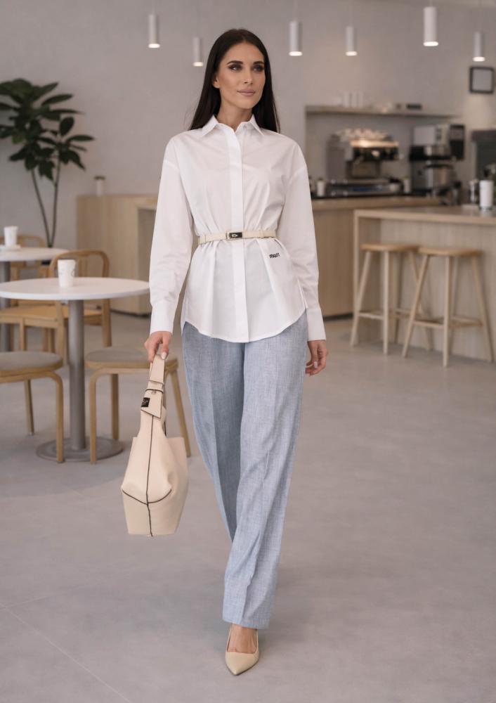 Fehér színű, pamut-vászon Magenta ing, laza fazonú, elején rejtett gombos záródással, széles gombolható mandzsettával. Elején hímzett Magenta márkajelzés.