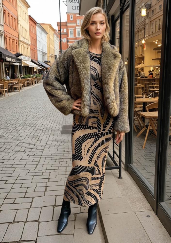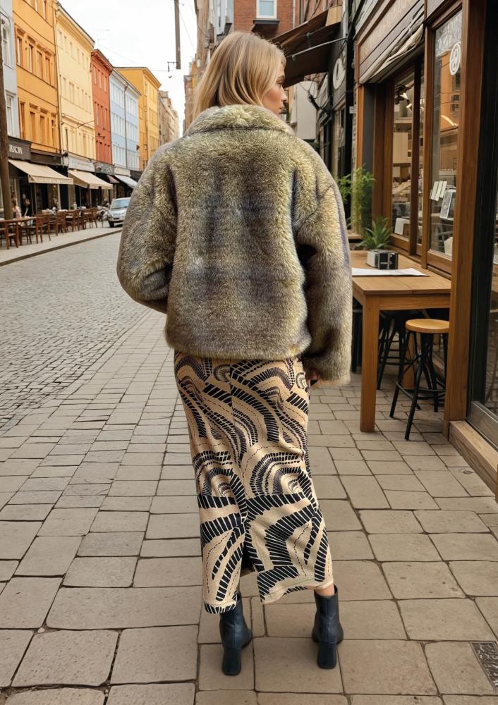 Barna színű, Magenta műszőrme kiskabát, laza fazonú, lehajtós gallérral, elején patentos záródással. Oldalán rávarrt textil Magenta márkajelzés.