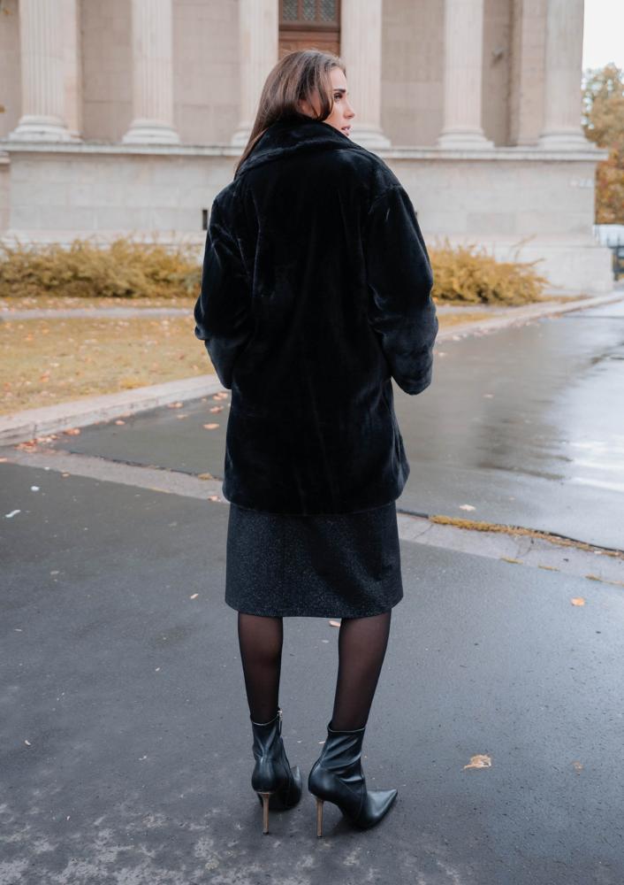 Fekete színű, műszőrme Magenta bunda, laza fazonú, széles kihajtós gallérral, zsebekkel, elején kapcsos záródással, levehető műszőrme kesztyűvel.