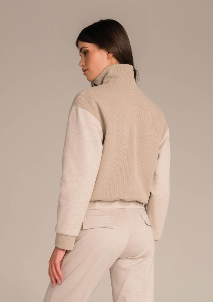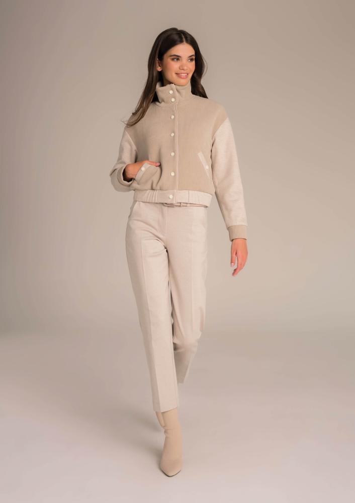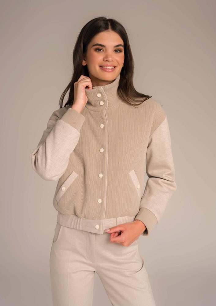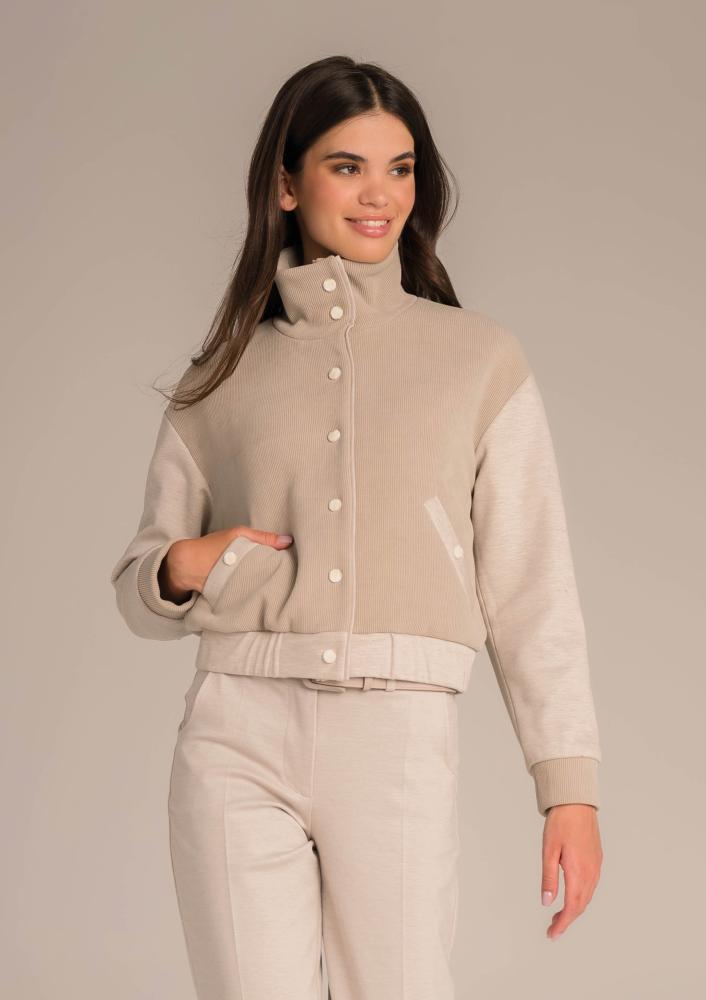 Bézs színű, Magenta bomber kebát, eleje-háta kordbársony anyagból, ujja elasztikus punto, laza fazonú, eleje patentos záródással, zsebekkel. Oldalán rávarrt textil Magenta márkajelzés.