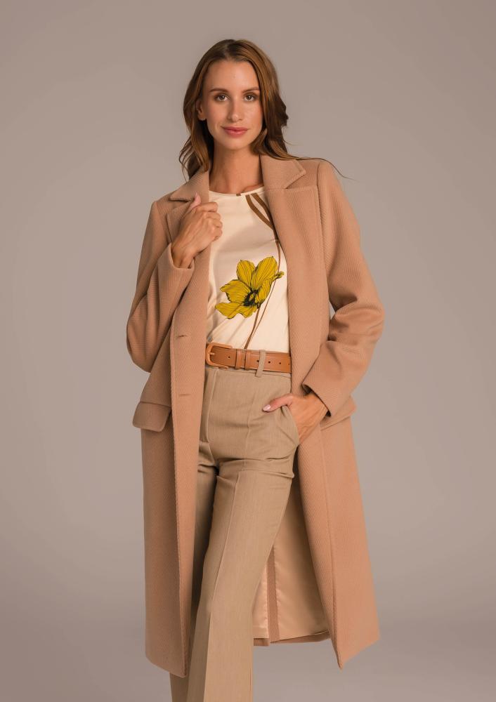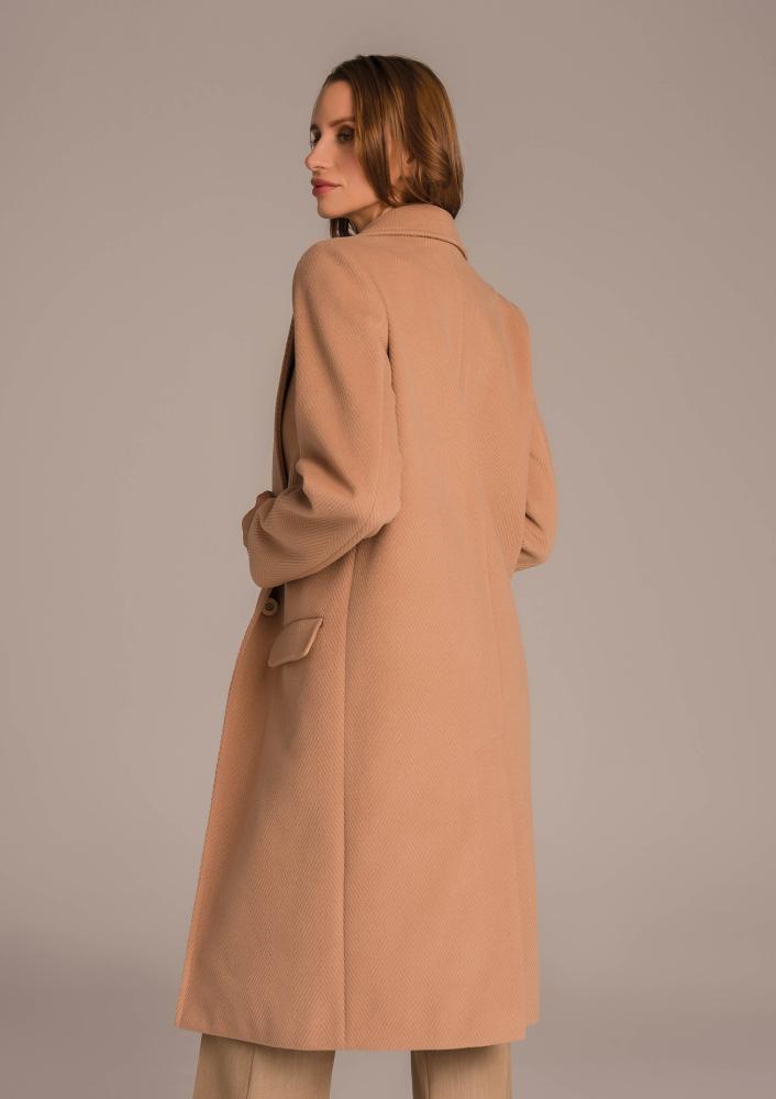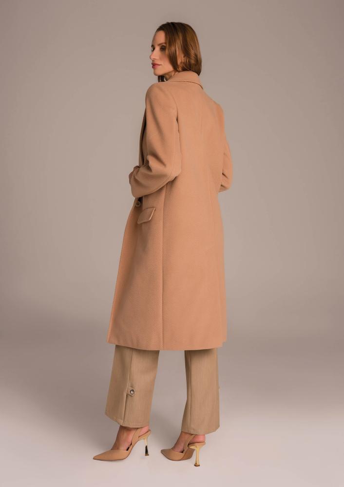 Barna színű, szövet Magenta kabát, laza fazonú, kihajtós gallérral, elején gombos záródással, zsebekkel, térdig érő hosszal. Oldalán rávarrt textil Magenta márkajelzés.