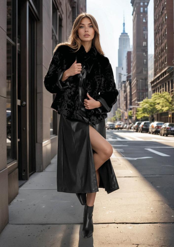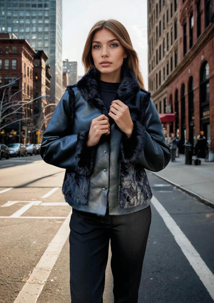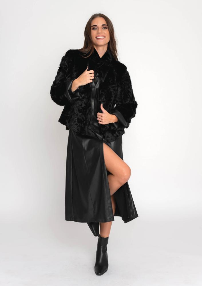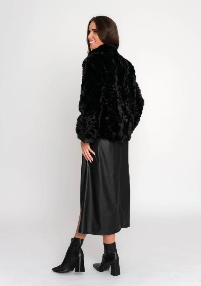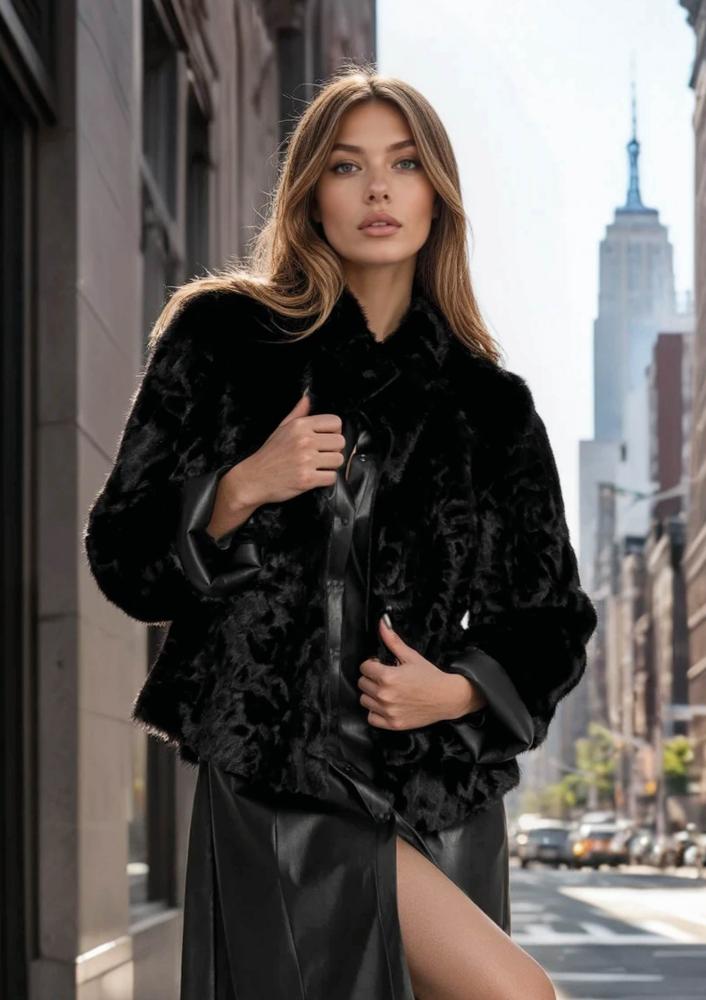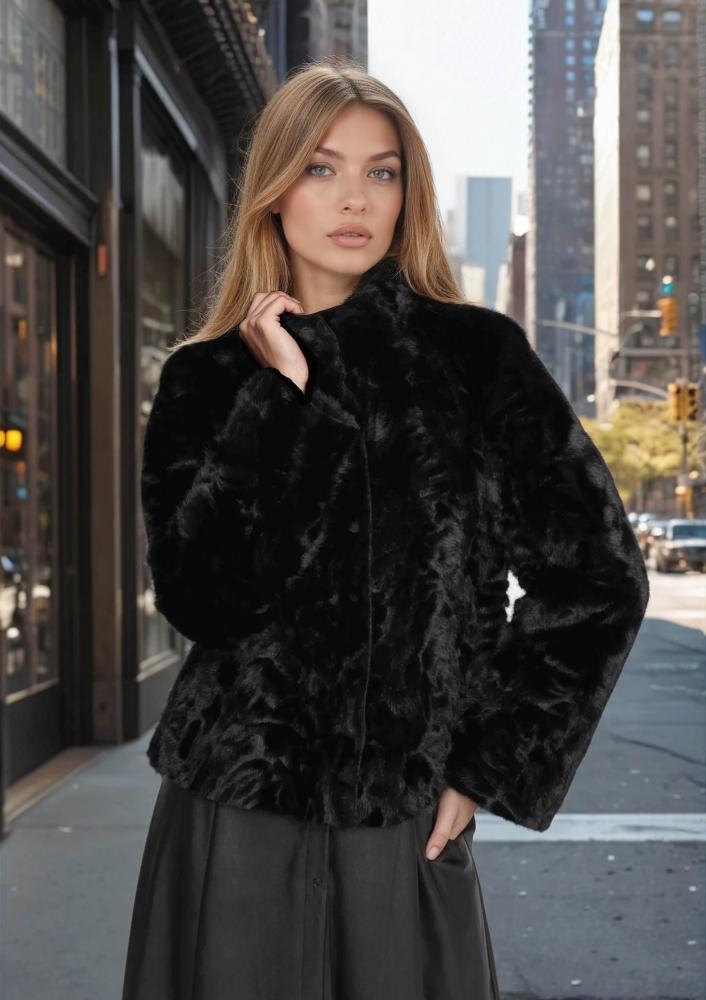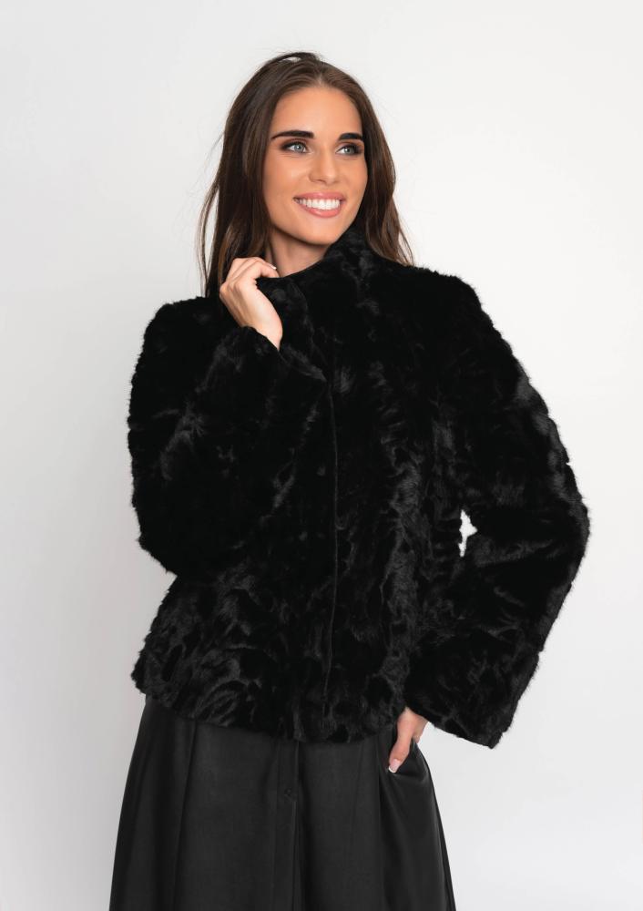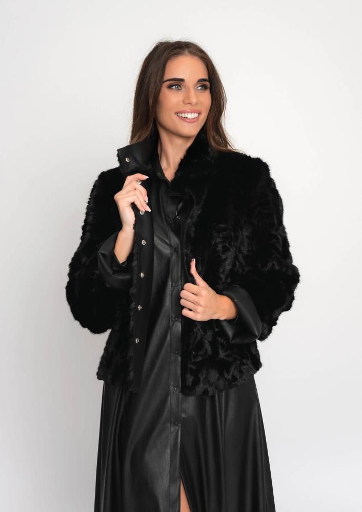 Fekete színű, műszörme Magenta kiskabát, laza fazonú, álló gallérral, elején pattentos záródással, bőr belső résszel amely kifordítható. Oldalán rávarrt textil Magenta márkajelzés.