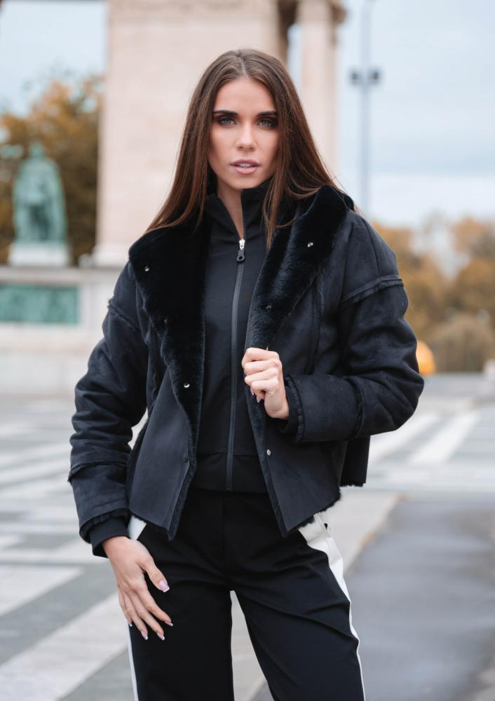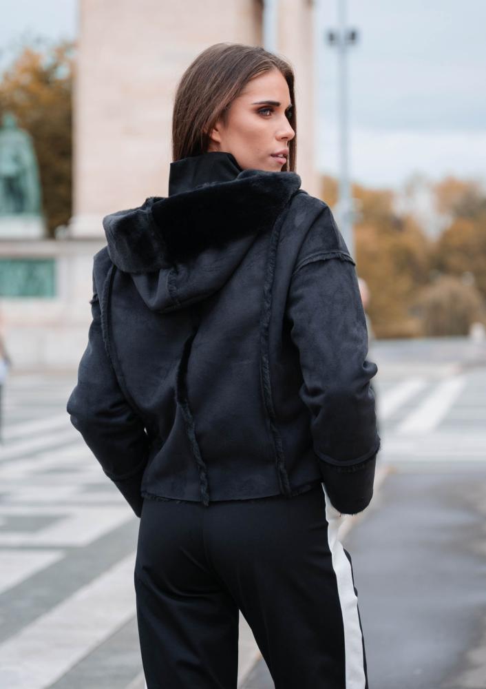 Fekete színű, műirha Magenta kabát, laza fazonú, kapucnival, elején patentos záródással. Oldalán rávarrt textil Magenta márkajelzés.