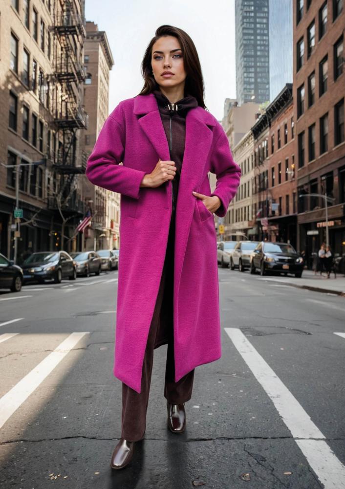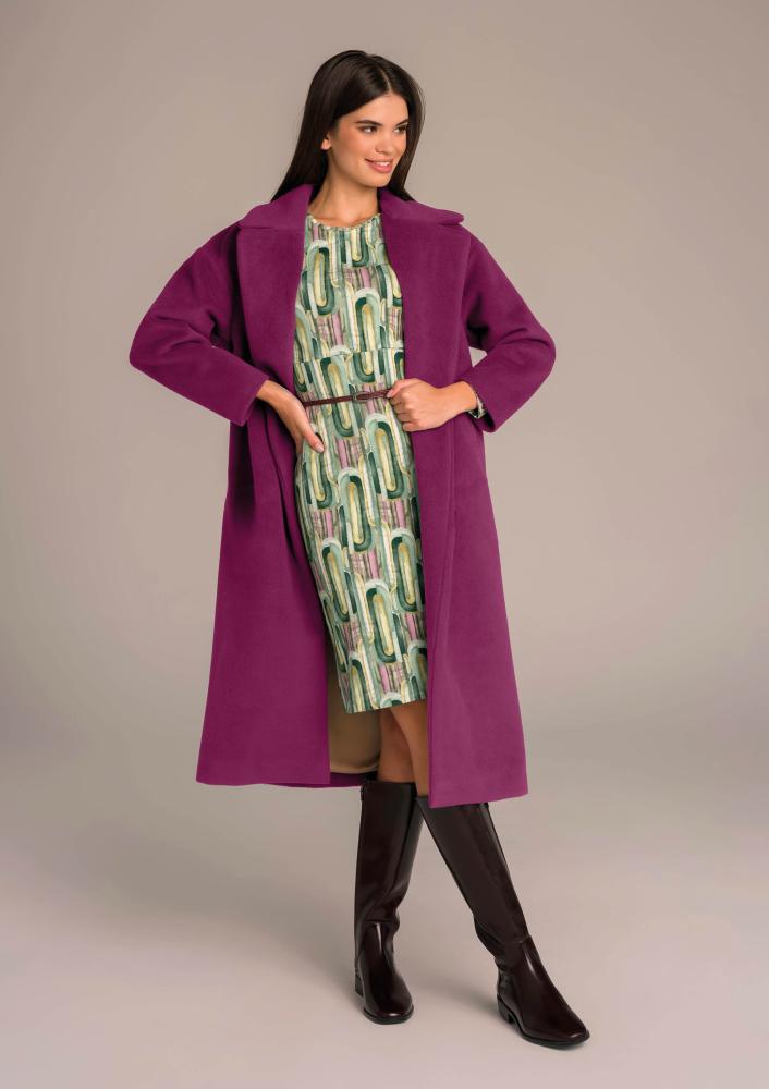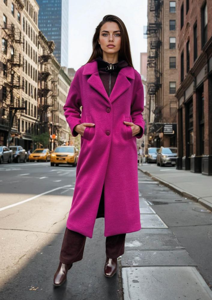Fuszia színű, hosszú Magenta szövetkabát, bő fazonú, bélelt, elején szegélyes zsebbel, elején gombos záródással. Hátul rávarrt fém Magenta márkajelzés.