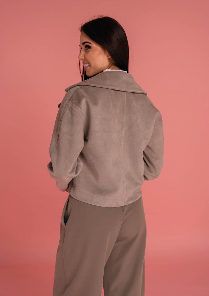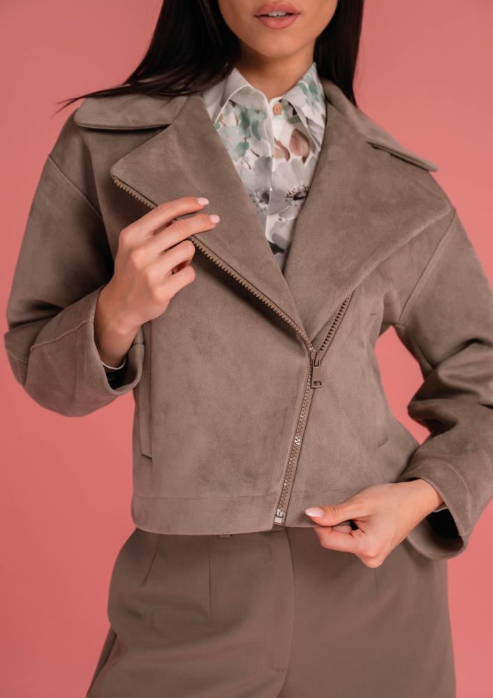 Barna színű, velúr hatású Magenta kabát, laza fazonú, rövid állású, elején zippzáras záródással, zsebekkel. Oldalán rávarrt textil Magenta márkajelzés.