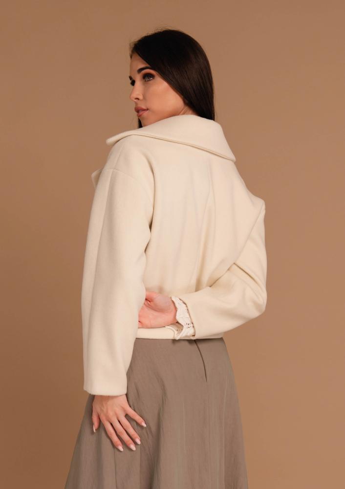 Vaj színű, kevert szálas Magenta kabát, laza fazonú, rövid állású, elején zippzáras záródással, zsebekkel. Oldalán rávarrt textil Magenta márkajelzés.