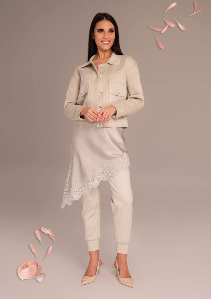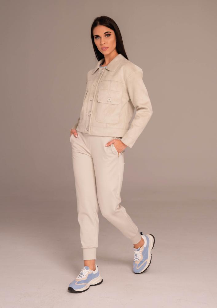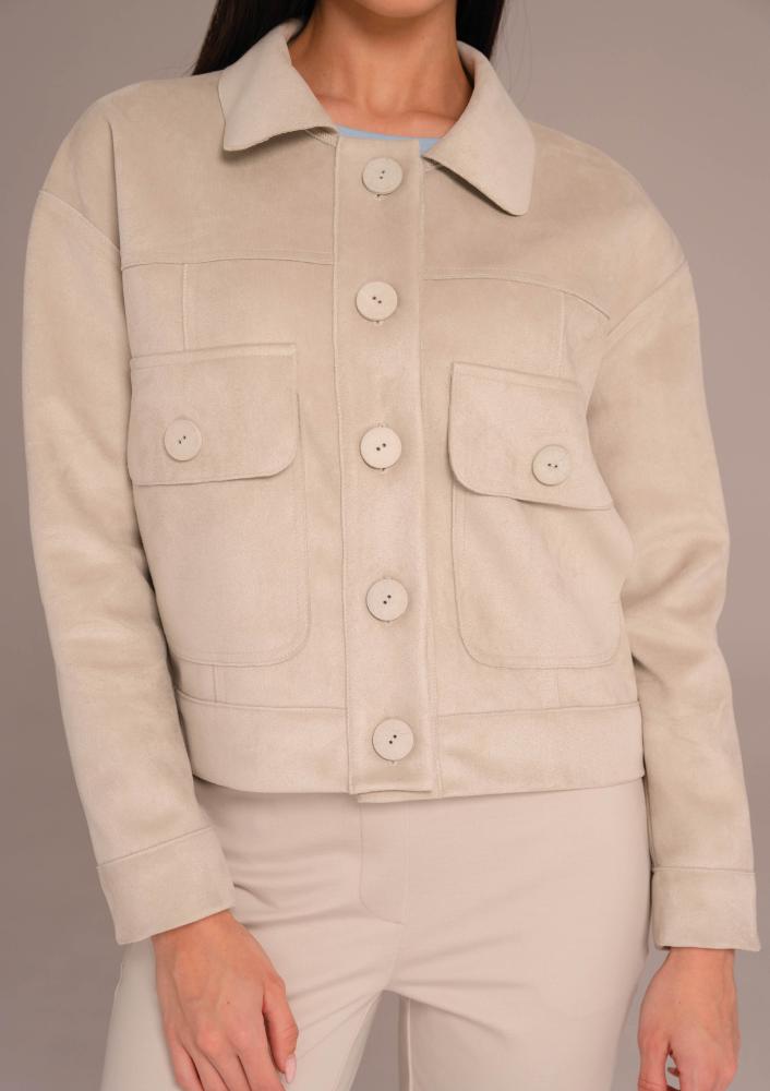 Bézs színű, velúr Magenta kiskabát, gallérral, rövidebb állású, elején gombos záródással, elején díszzsebekkel. Hátán rávarrt textil Magenta márkajelzés.