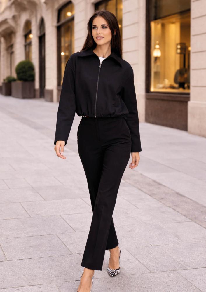 Fekete színű, Magenta szövet kiskabát, rövid állású, gallérral, elején zippzáras záródással, elől-hátán hajtásokkal díszített. Hátul rávarrt Magenta márkajelzés.