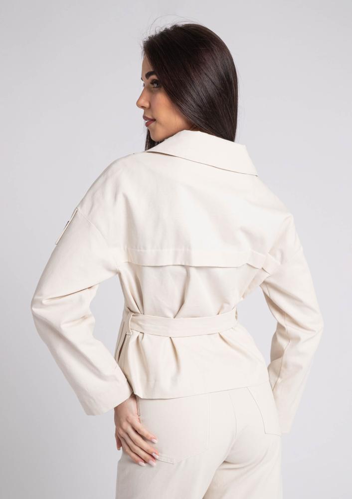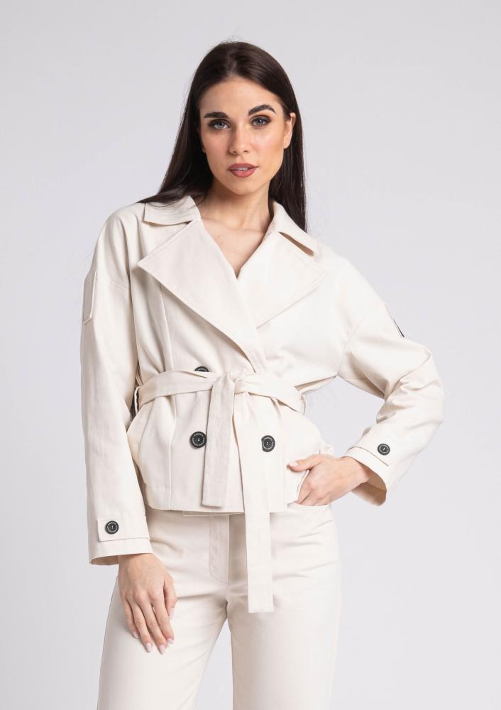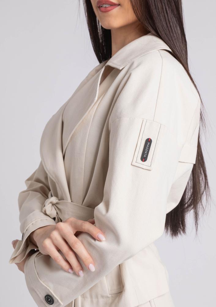 Vaj színű, Magenta ballon kabát, szűk fazonú, rövid állású, elején dupla gombos záródással, gallérral, derekán saját anyagából megkötővel. Ujján rávarrt Magenta márkajelzés.