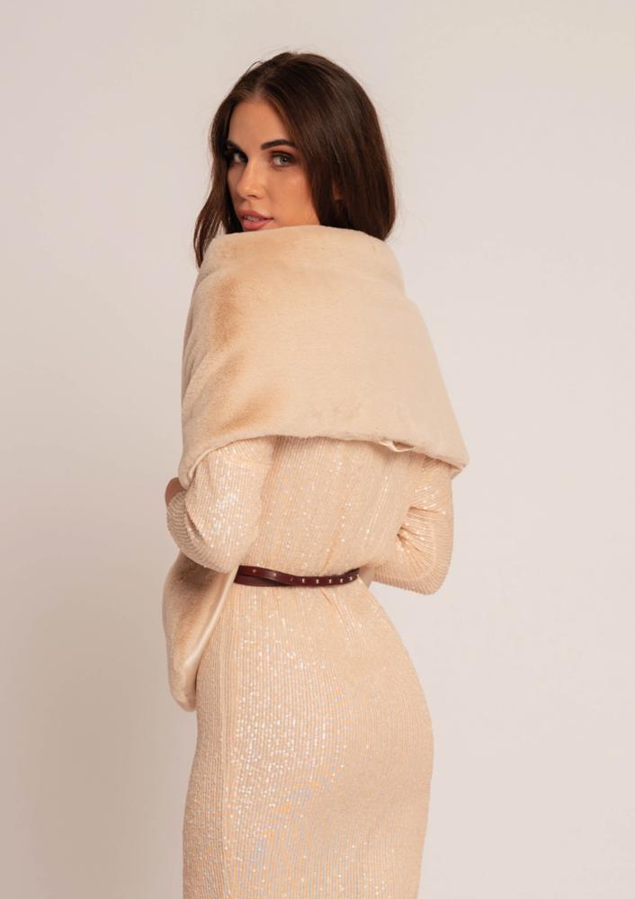 Vaj színű, Magenta műszőrme bolero, több funkcionális, véllra és nyakra tehető, oldalán zsebekkel. Oldalán rávarrt textil Magenta márkajelzés.