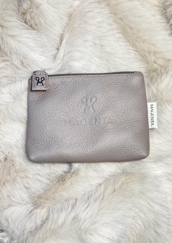 Fangó színű, valódi bőrből, kézzel készült, kis méretű Magenta neszeszer, zippzáras záródással. Belül egyterű, elején anyagába nyomott és oldalán rávarrt márkajelzéssel.