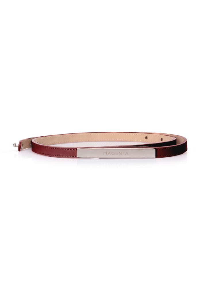 Vékony, valódi bőrből készült Magenta öv bardó színben. Bármilyen alkalomra és minden öltözékhez kombinálható. Öv teljes hossza : 85cm, mely hét pontban állítható 68cm, 70cm, 72cm, 75cm, 77cm, 80cm, 83cm. Az öv szélessége: 1cm