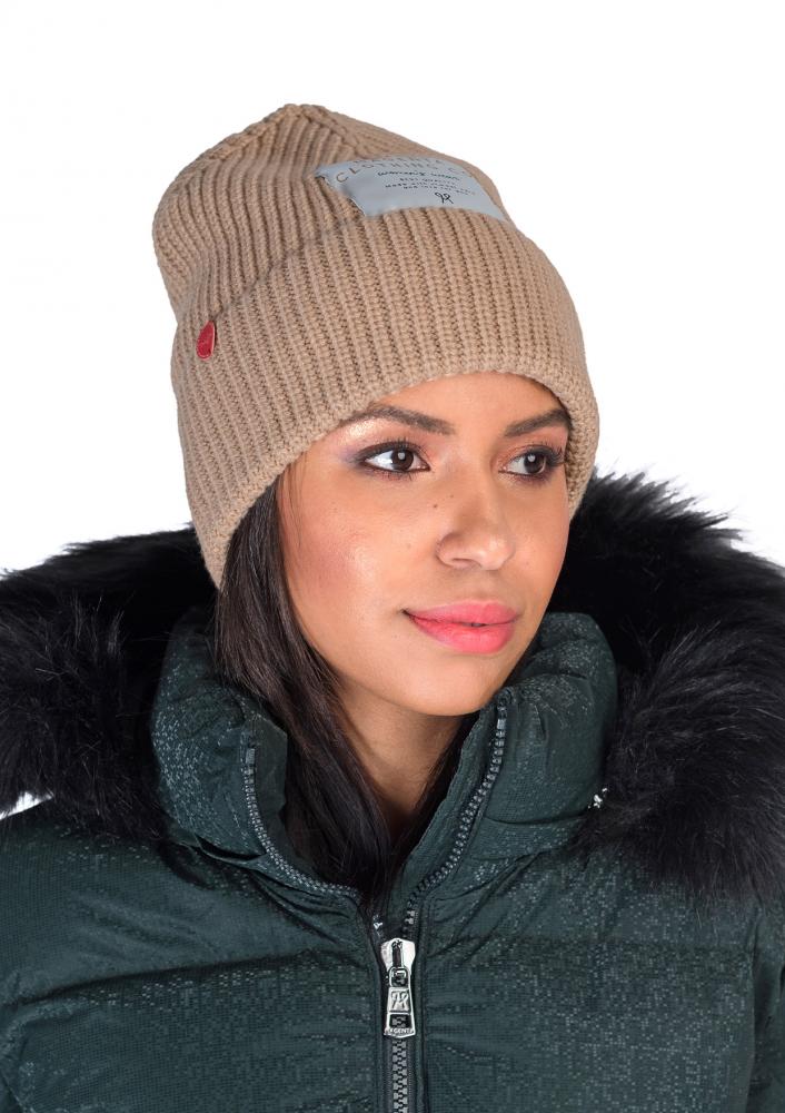 Barna színű, bordás kötött Magenta sapka, elején rávarrt Magenta márkajelzés, felhajtott szegélyen rávarrt bőr hatású Magenta márkajelzés.