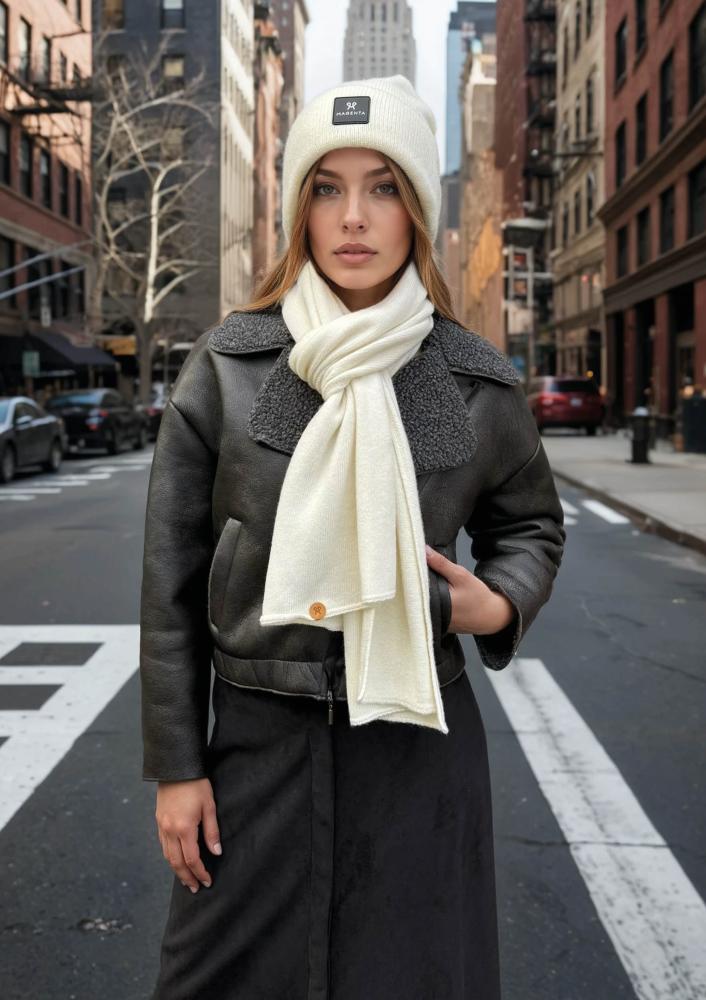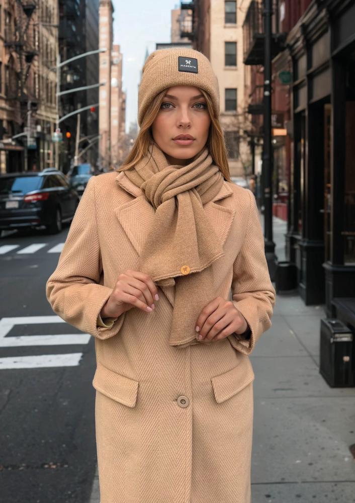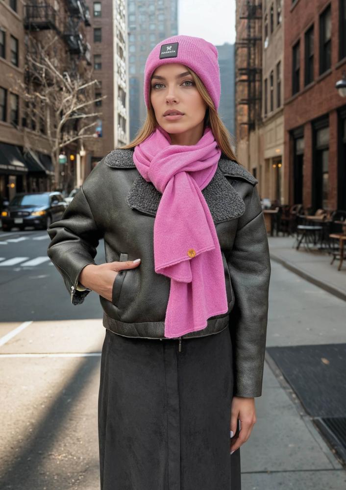 Sárga színű, finom, vékony kötésű, elasztikus Magenta sapka, széles visszahajtott résszel. Elején rávarrt textil Magenta márkajelzés.