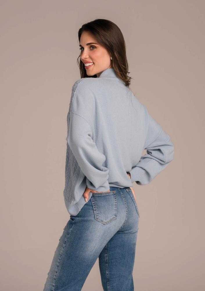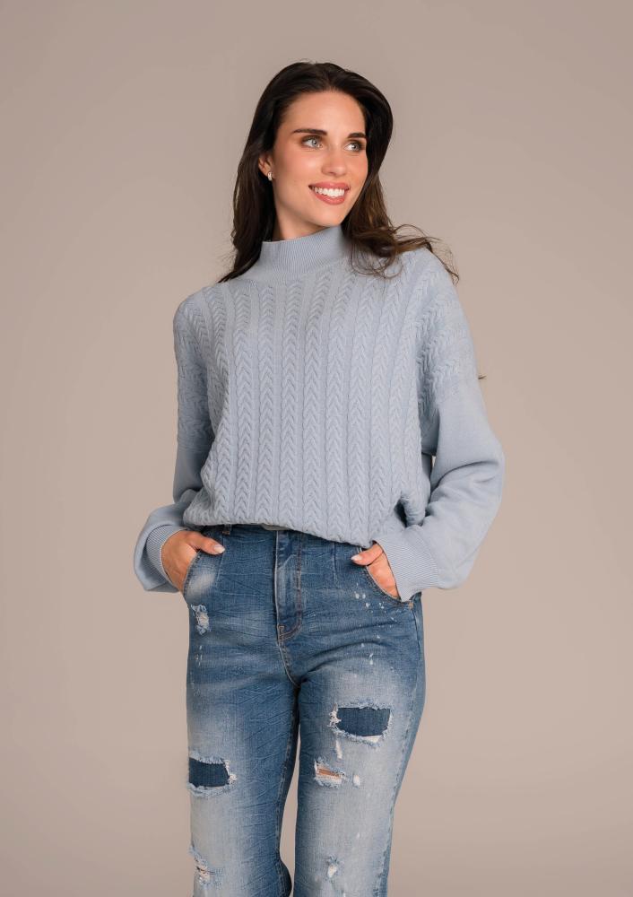 Kék színű, Magenta kötött pulóver, bő fazonú, garbó nyakkal. Ujján rávarrt Magenta márkajelzés.