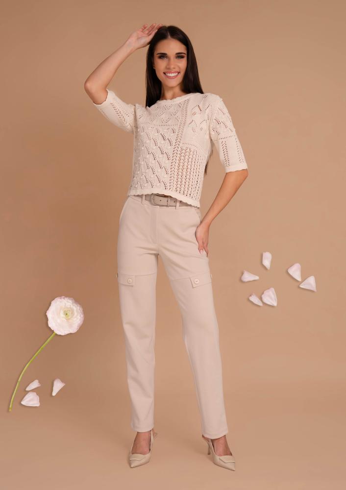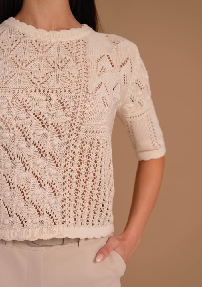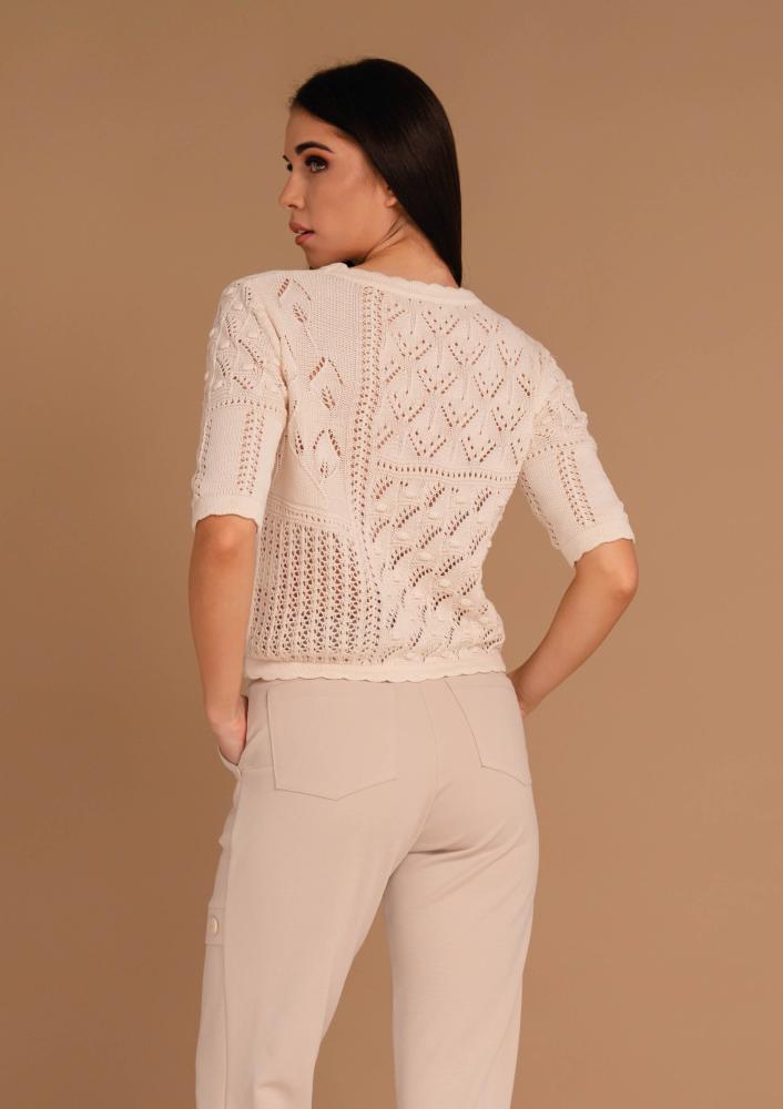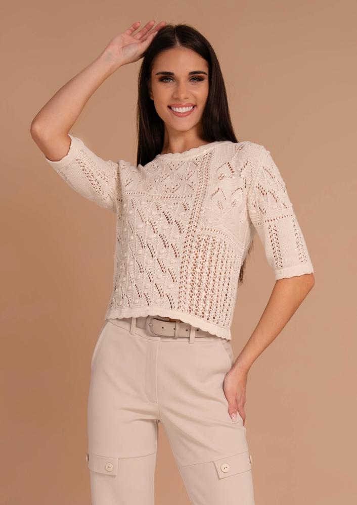 Vaj színű, vékony kötésű, Magenta felső, kerek nyakkivágással, rövid ujjal. Elején rávarrt Magenta márkajelzés.