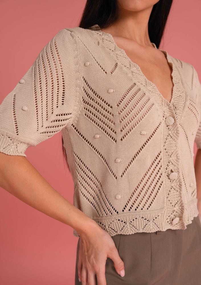 Bézs színű, elasztikus kötött Magenta kardigán, laza fazonú, rövid ujjal, elején gombos záródással. Oldalán rávarrt textil Magenta márkajelzés.
