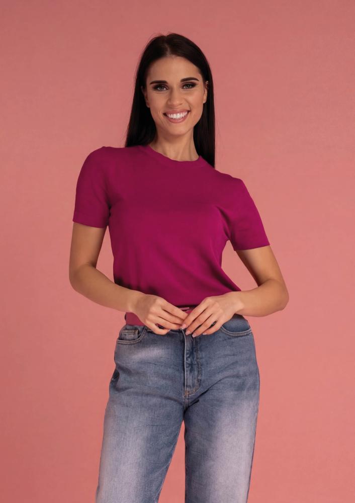 Ciklámen színű, elasztikus kötött Magenta felső, vékonyabb kötésű, laza fazonú, kerek nyakkivágással, rövid ujjal. Oldalán rávarrt textil Magenta márkajelzés.