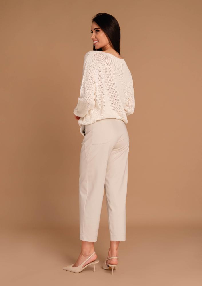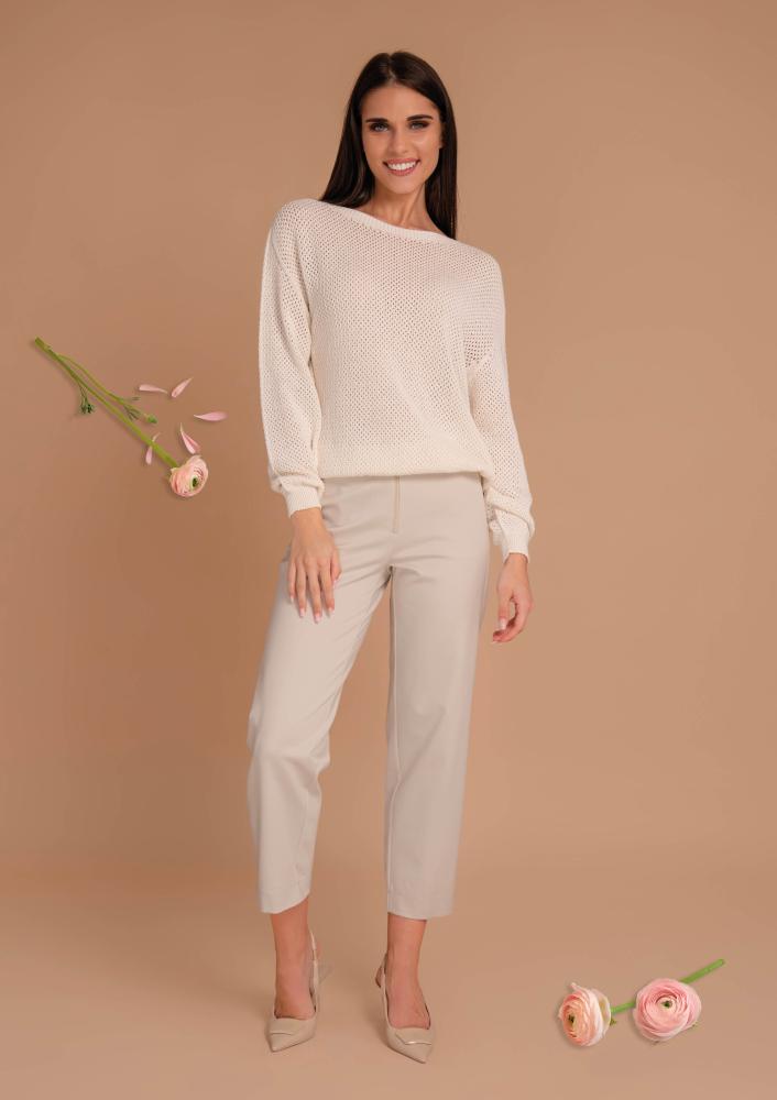 Vaj színű, elasztikus viszkóz Magenta kötött felső, laza fazonú, ejtett vállrésszel, hosszú ujjal. Oldalán rávarrt textil Magenta márkajelzés.