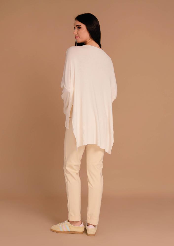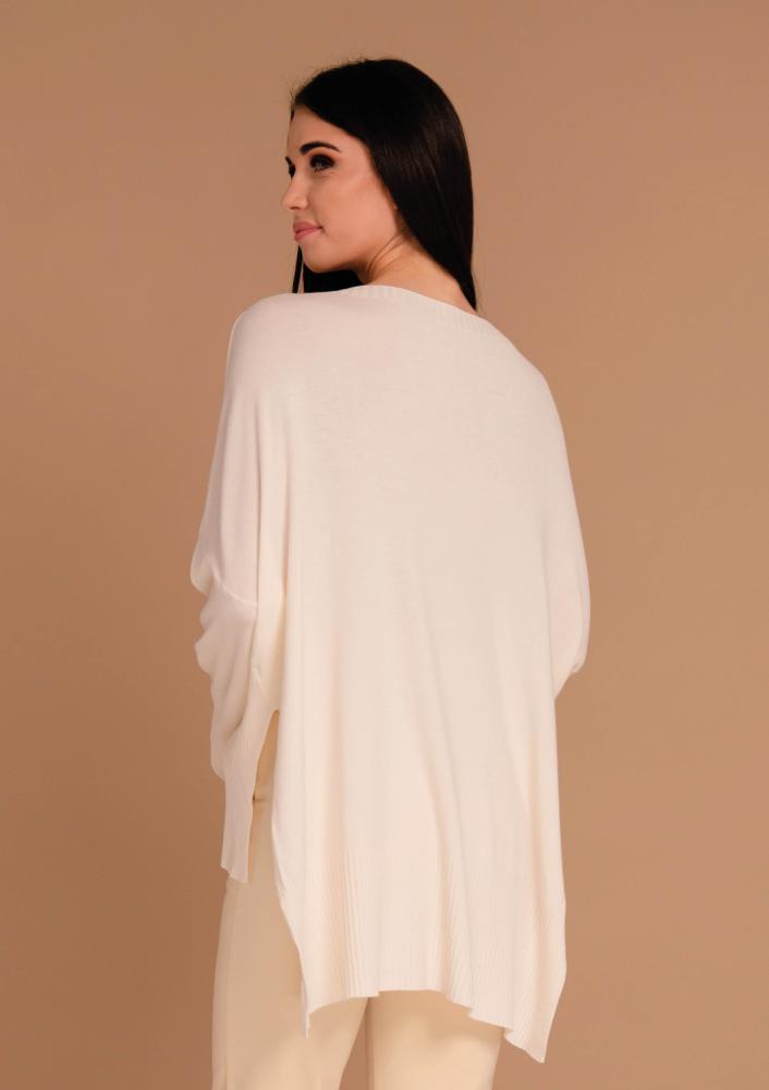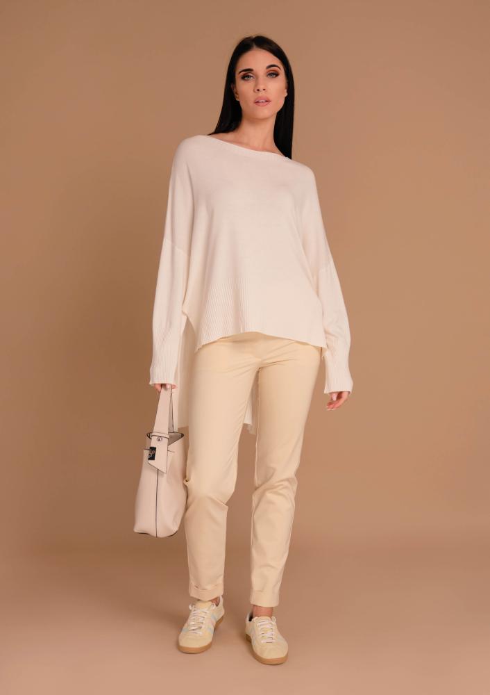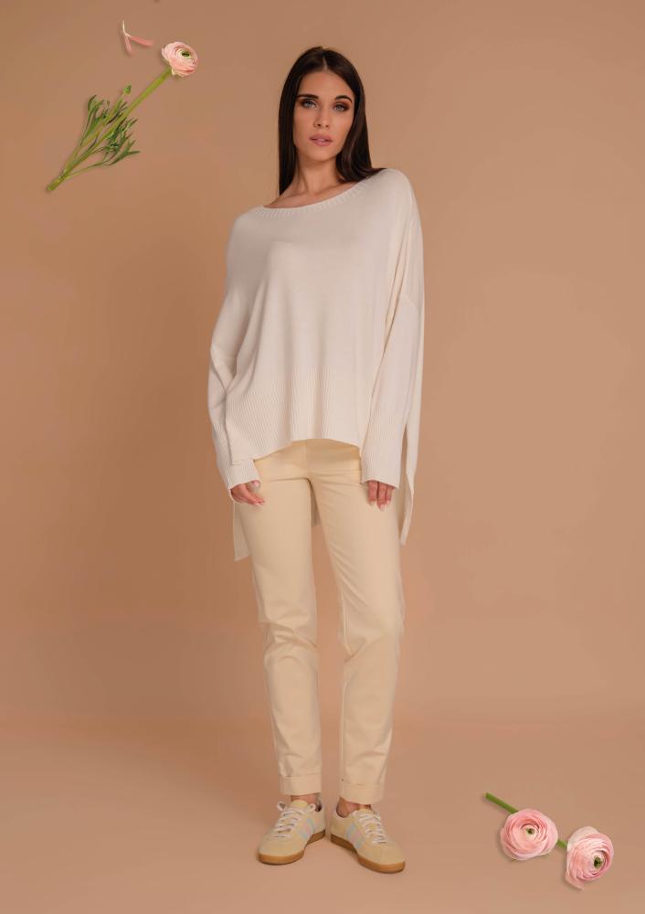 Vaj színű, Magenta kötött felső, laza fazonú, vékonyabb kötésű, csónak nyakkivágással, hosszú ujjal, hátán hosszabb. Oldalán rávarrt textil Magenta márkajelzés.