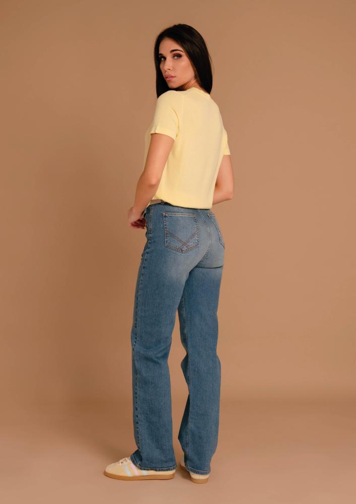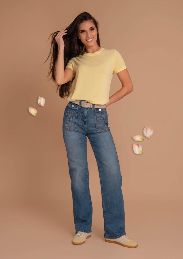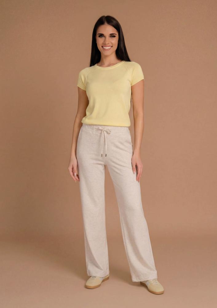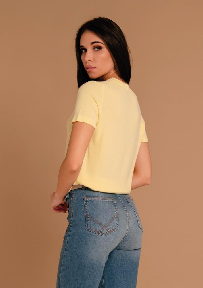Sárga színű, elasztikus kötött Magenta felső, szűkebb fazonú, vékonyabb kötésű, rövid ujjal, kerek nyakkivágással. Oldalán rávarrt textil Magenta márkajelzés.