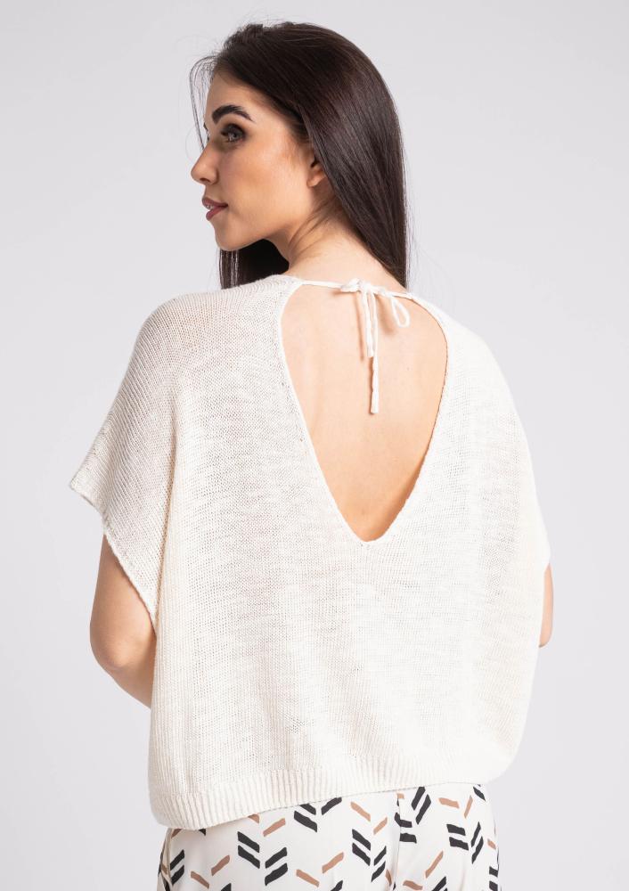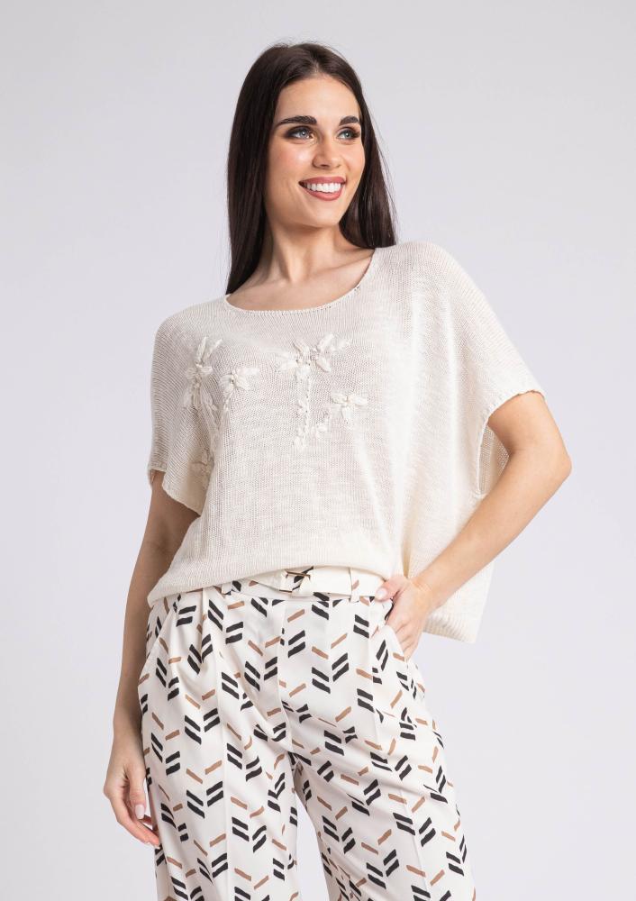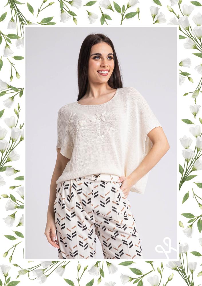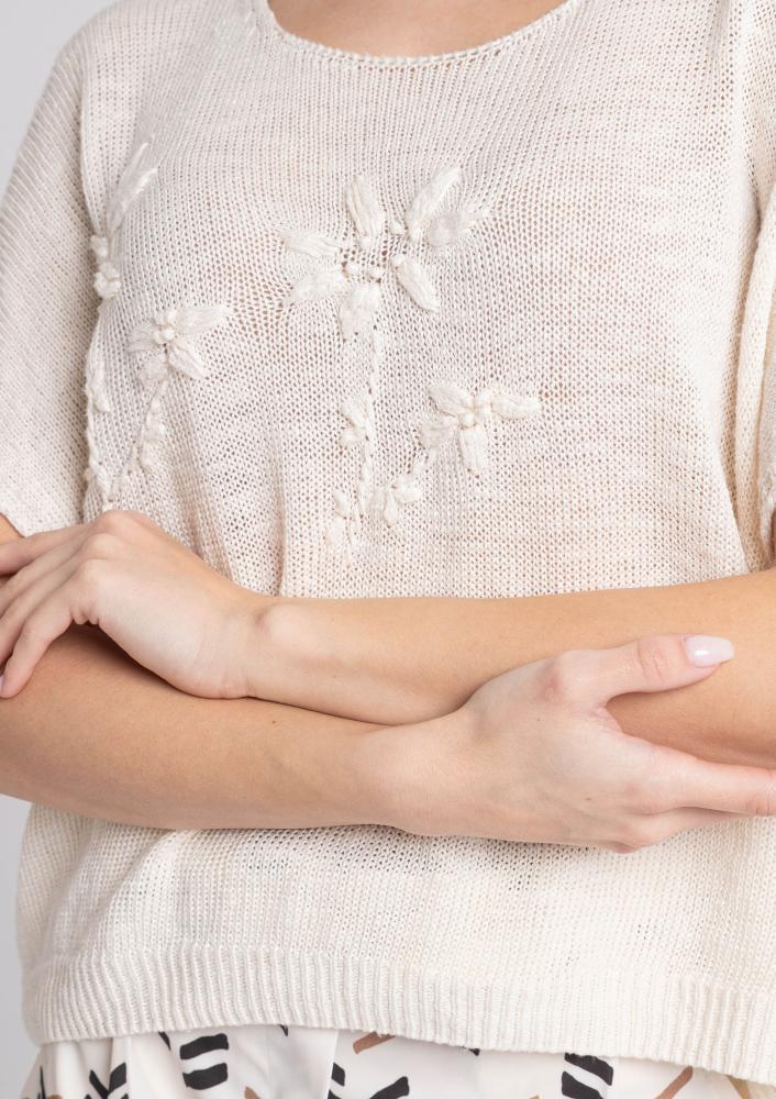 Vaj színű, vékony kötésű, Magenta kötött felső, laza fazonú, kerek nyakkivágással, rövid ujjal, elején virág díszítéssel. Oldalán rávarrt textil Magenta márkajelzés.