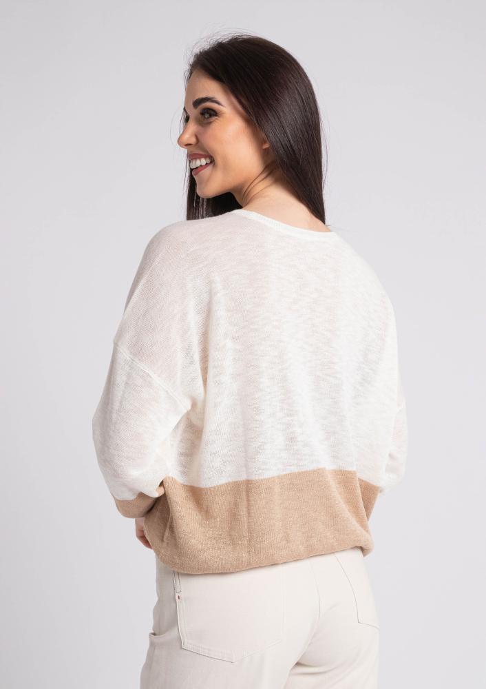 Vaj színű, kötött Magenta felső, laza fazonú, elején kerek nyakkivágással, hosszú ujjakkal, alján más színnel kombinált. Oldalán rávarrt textil Magenta márkajelzés.