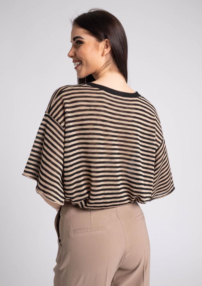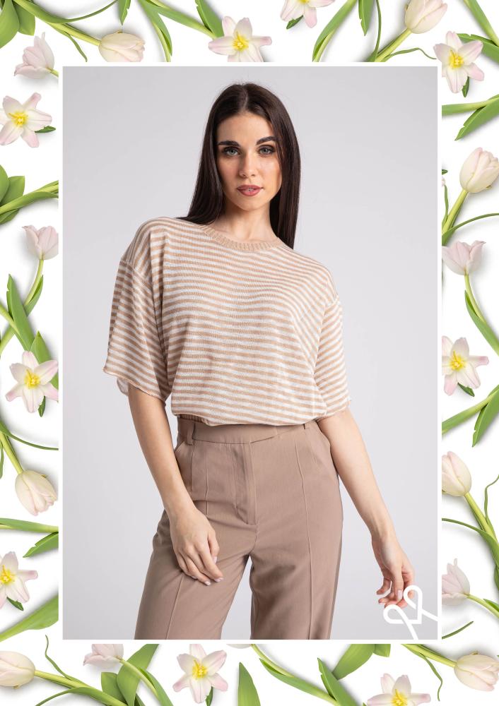 Csíkos, vékony kötésű Magenta felső, laza fazonú, elején kerek nyakkivágással, ejtett vállrésszel, rövid ujjakkal. Oldalán rávarrt textil Magenta márkajelzés.