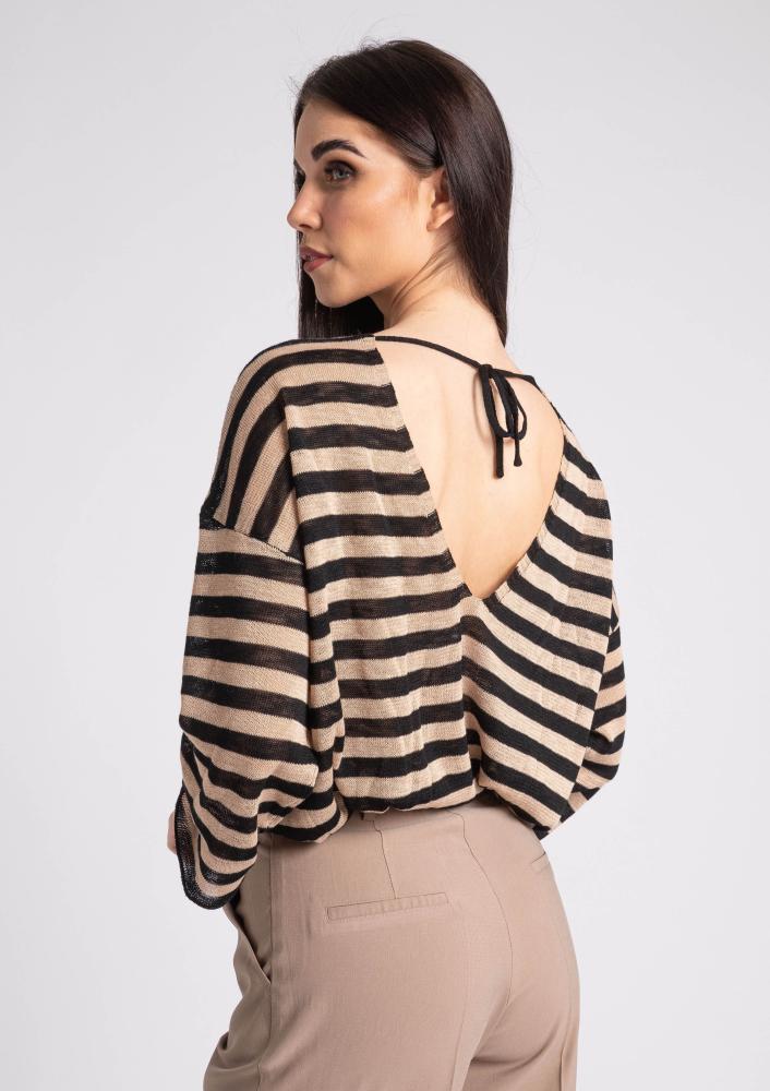 Csíkos, vékony kötésű Magenta felső, laza fazonú, elején kerek nyakkivágással, ejtett vállrésszel, hátán megkötővel, hosszú ujjakkal. Oldalán rávarrt textil Magenta nárkajelzés.