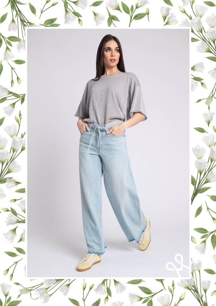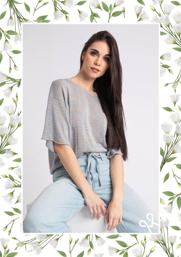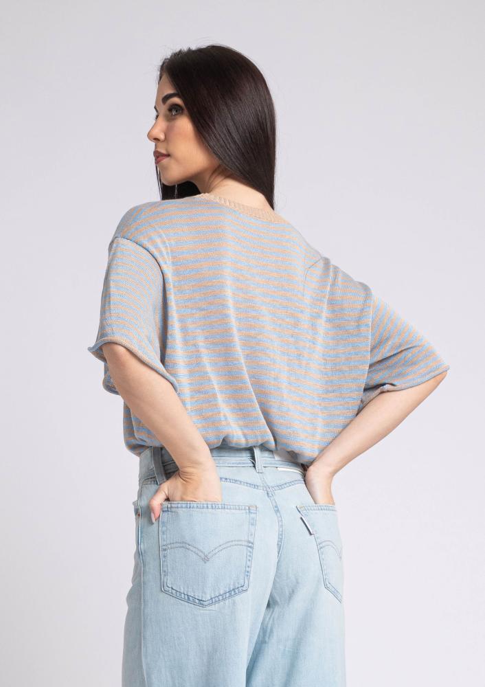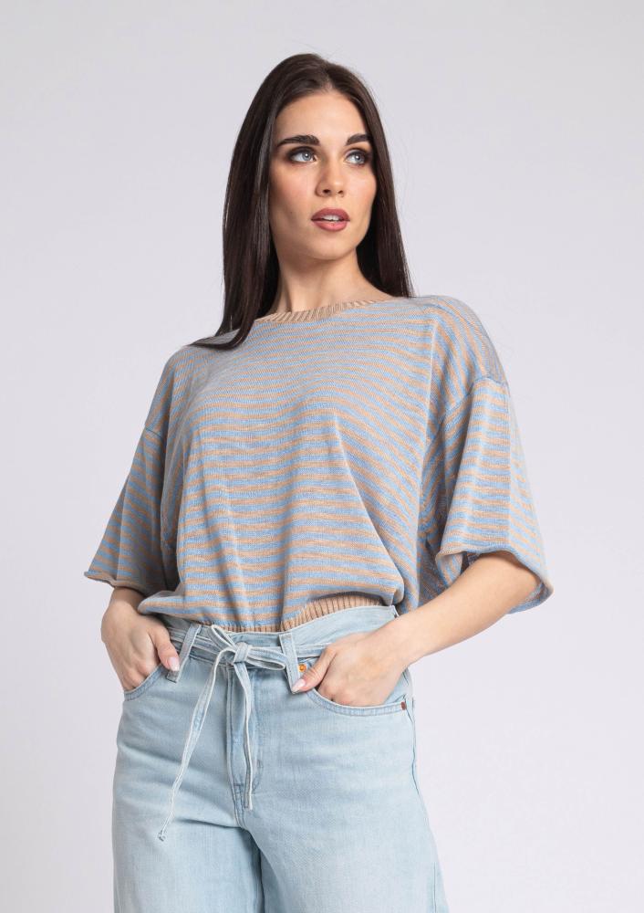 Csíkos, kötött Magenta felső, bő fazonú, vékony kötésű, kerek nyakkivágással, ejtett vállal, rövid ujjal. Oldalán rávarrt textil Magenta márkajelzés.